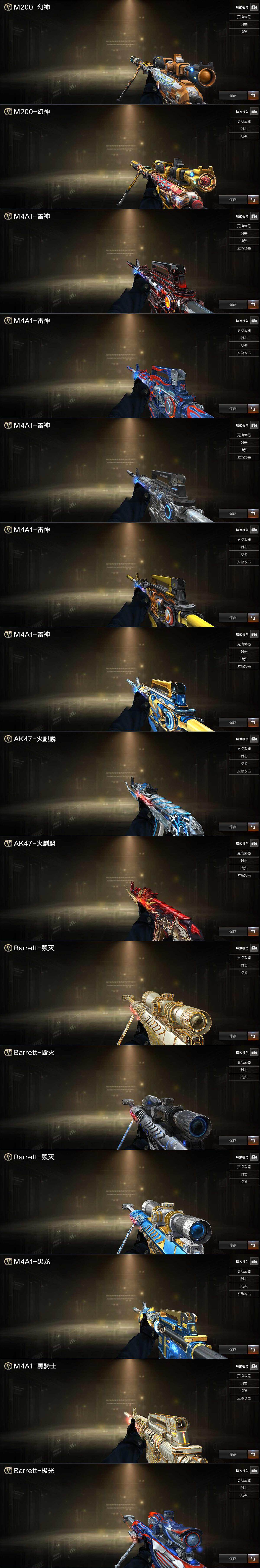 【热门武器】:传说光耀,QBZ03-金色蔷薇,HK417-朱雀,M200-幻神,M200-竞技荣光,死亡之眼,白虎-电玩蓝兔,柯尔特-冠军之特,金色小号,C.A.T,Cat-刀锋,M4A1-黑骑士*3,汤姆逊-烈龙*7,RPK-盘龙*3,加特林-炼狱*2,斯泰尔-蝴蝶,沙鹰-修罗