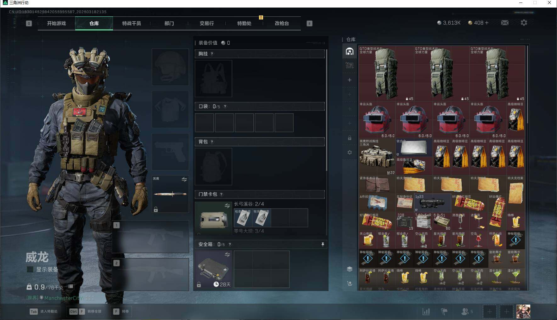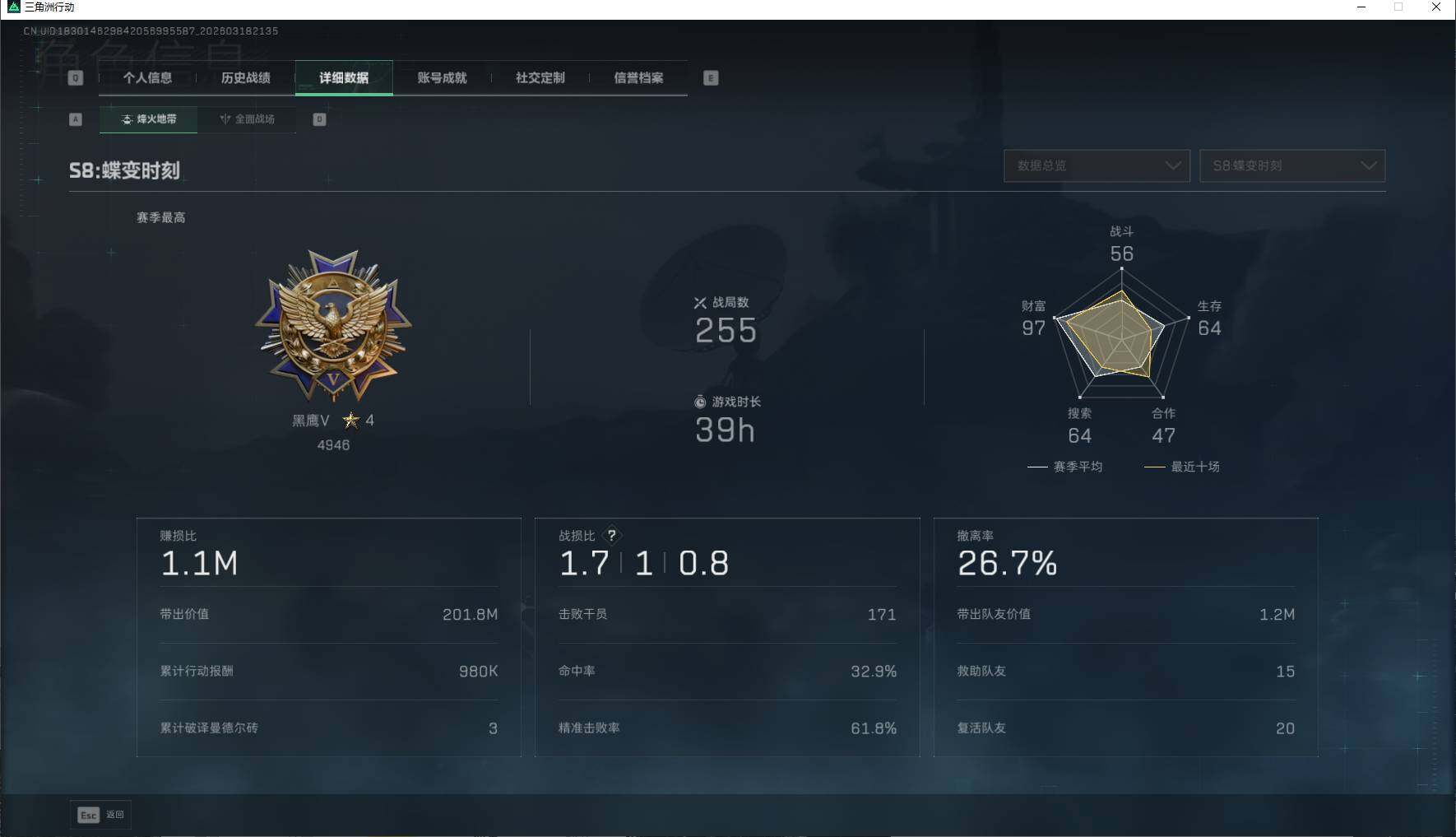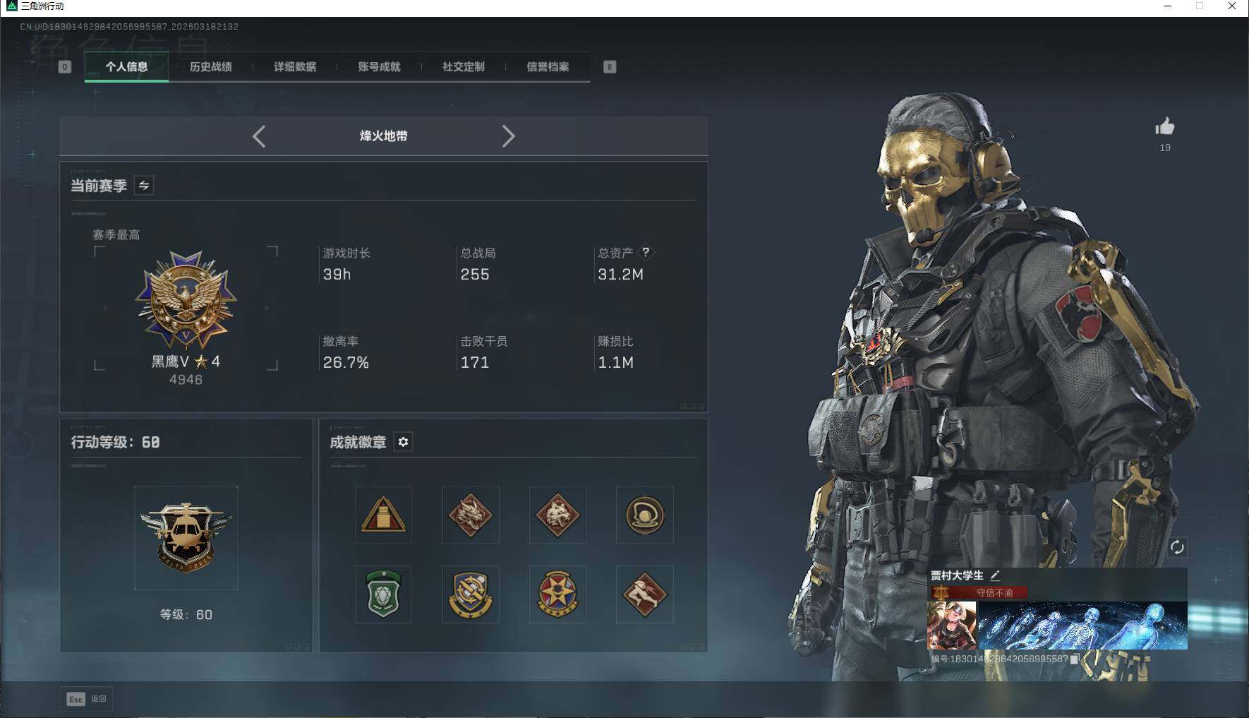 31m总资产-3613k哈夫币-60烽火等级-黑鹰-27战场等级-上等兵【干