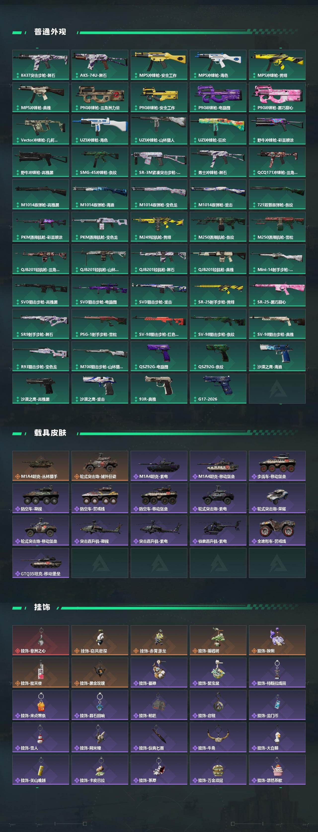 【传说外观】:M4A1突击步枪-蚀金玫瑰,M4A1突击步枪-阿米娅,ASh-12战斗步枪-鹅鸭杀,AUG突击步枪-悠然茶歇,SG552突击步枪-运动员,AK-12突击步枪-特斯拉线圈,SCAR-H战斗步枪-启航,G3战斗步枪-骑士,CAR-15突击步枪-阿米娅,腾龙突击步枪-捞点薯条,腾龙突击步枪