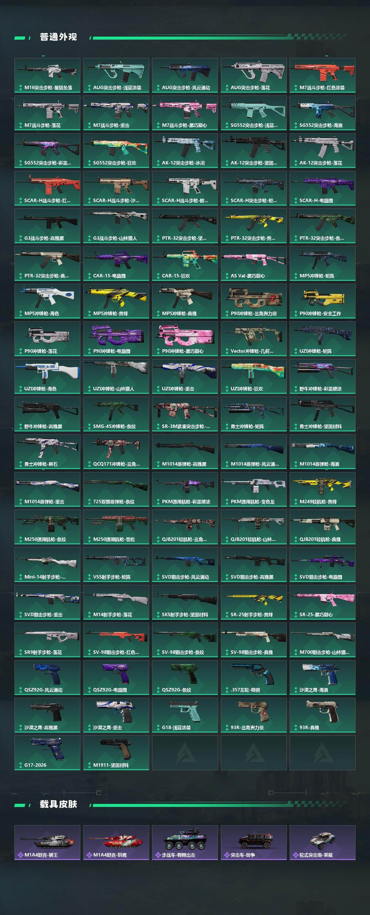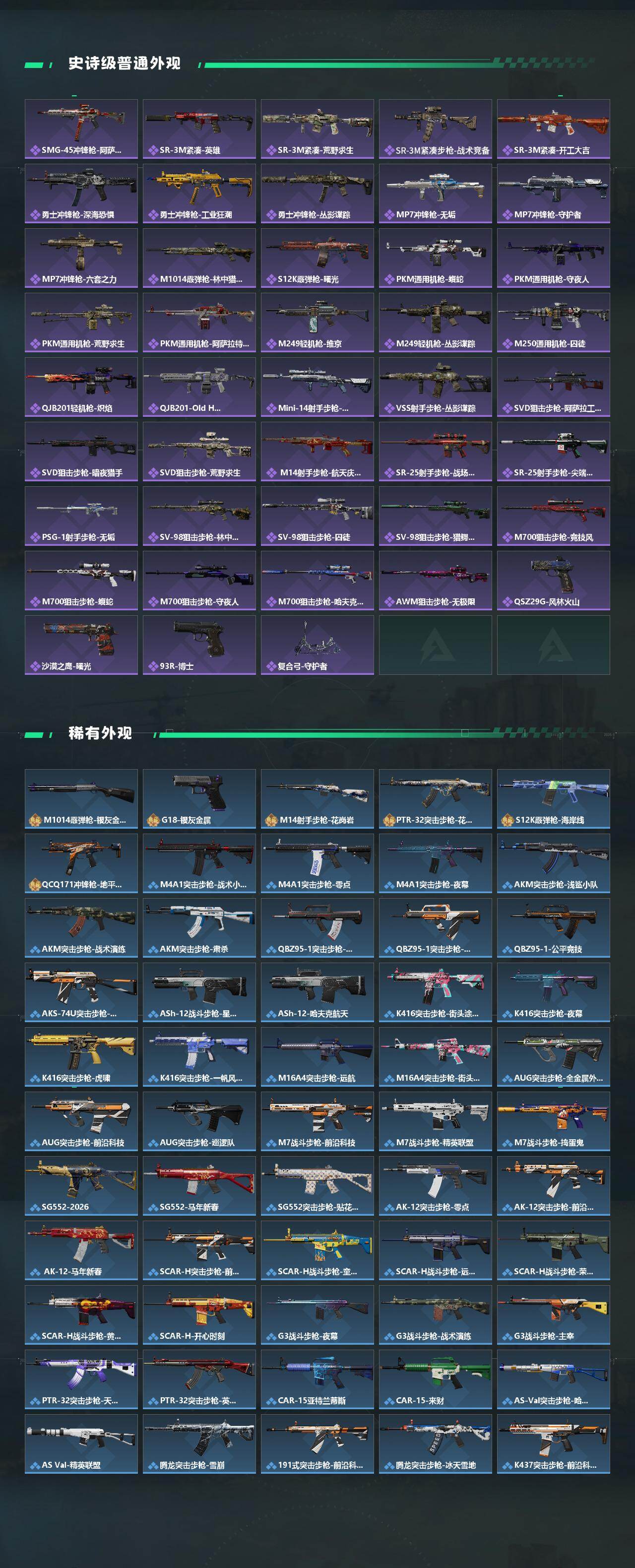 【传说外观】:M4A1突击步枪-蚀金玫瑰,M4A1突击步枪-阿米娅,QBZ95-1突击步枪-凌霄戍卫,ASh-12战斗步枪-鹅鸭杀,M16A4突击步枪-狩猎时刻,AUG突击步枪-悠然茶歇,M7战斗步枪-怜悯,M7战斗