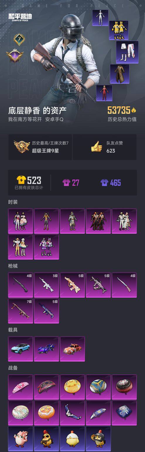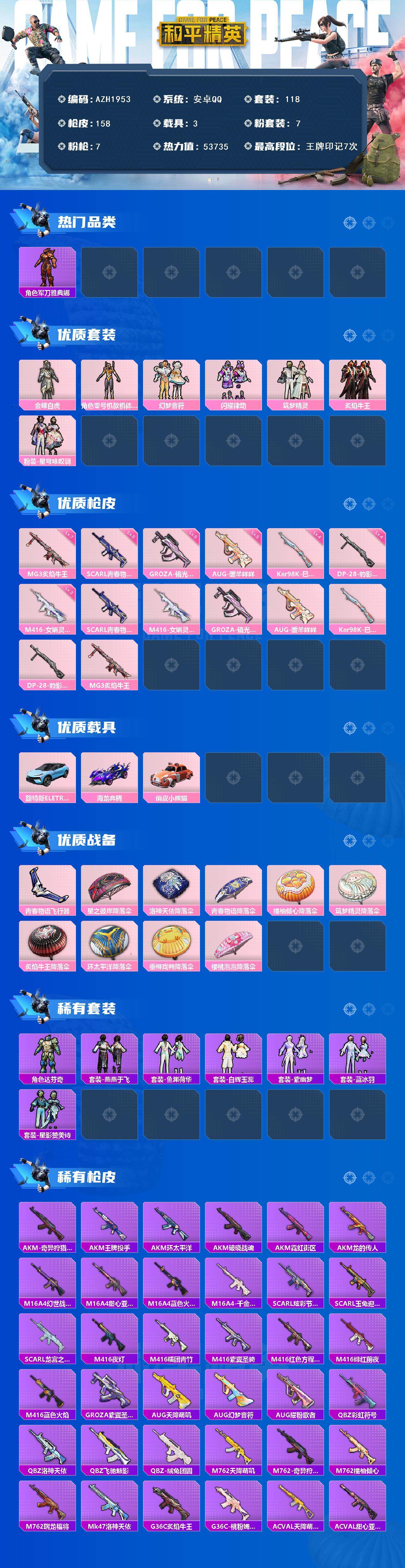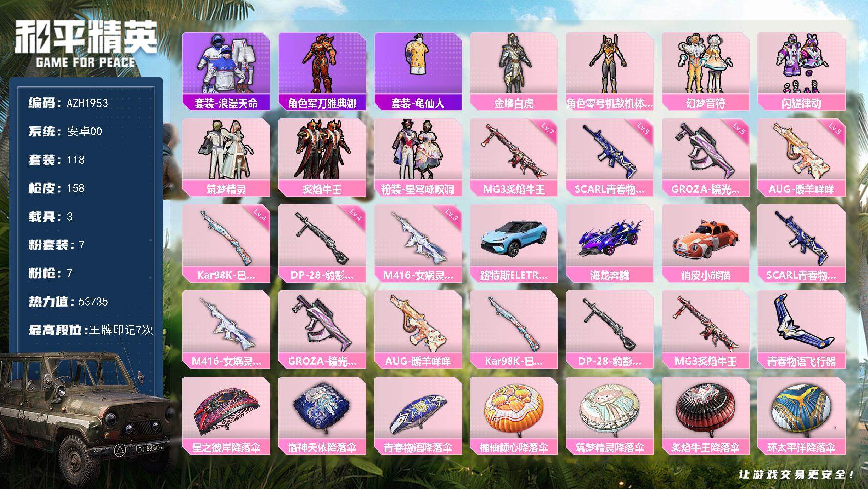 【AZH1953】安卓 手Q【黄螳螂 三级女娲灵识M416满级炙焰牛王MG3 3载具】7粉装-7特效枪-3载具-1粉色飞行器-53735热力值-7王牌印记-118套装-158枪皮