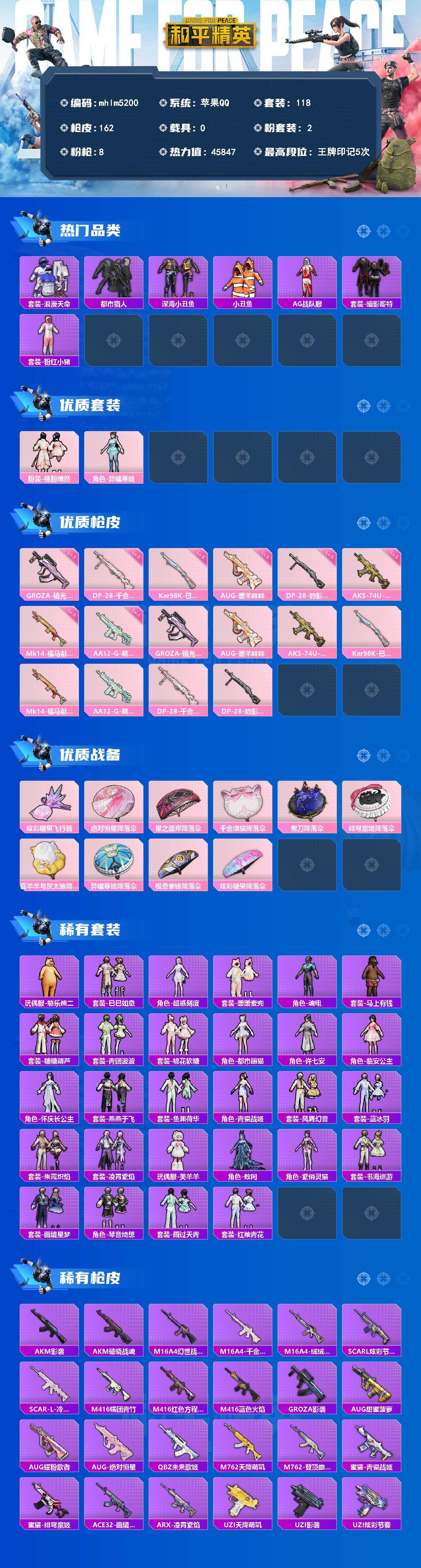 【mhlm5200】苹果 手Q-2粉装-8特效枪-0载具-2粉色飞行器-45847热力值-5王牌印记-118套装-162枪皮