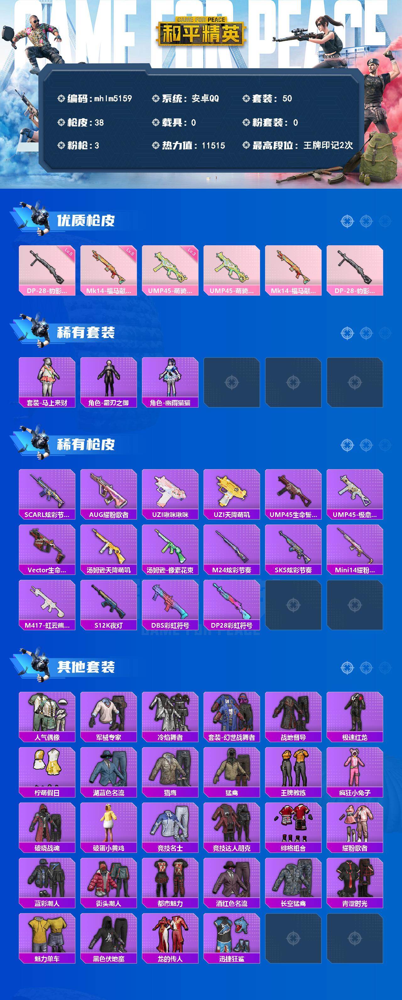 【mhlm5159】安卓 手Q-0粉装-3特效枪-0载具-0粉色飞行器-11515热力值-2王牌印记-50套装-38枪皮
