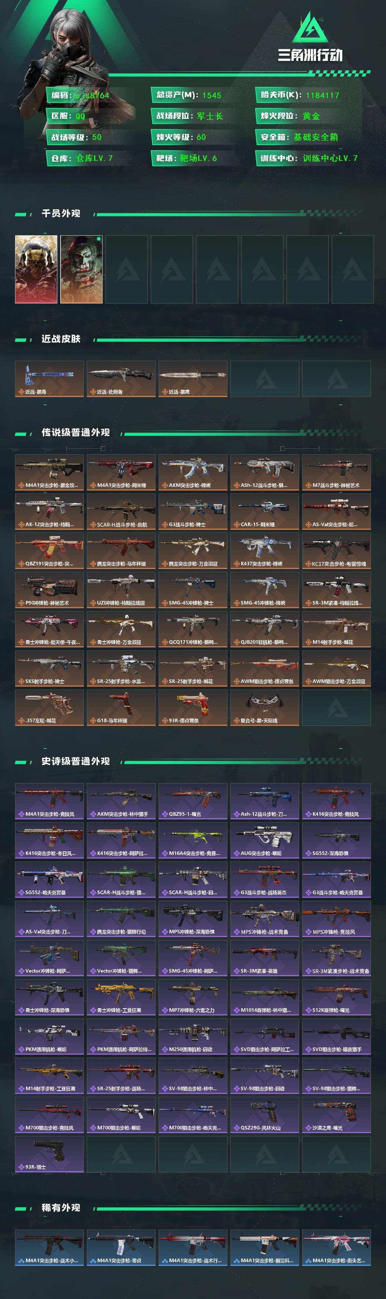 【sjs8764】可二次账号总资产1.5b现金1.1b 红狼玫瑰+黑海 大额资产皮肤号 烽火地带段位: 黄金 全面战场段位: 军士长 总资产: 1545000000 哈夫币: 1184117000 sjs8764 干员外观: 红狼-蚀金玫瑰,红狼-电锯惊魂 传说武器皮肤: M4A1突击步枪-蚀金玫瑰,M7战斗步枪-神秘艺术,P90冲锋枪-神秘艺术,SR-25射手步枪-水墨云图,AS Val突击步枪-蛇年祥瑞,近战-黑海,SMG45冲锋枪-骑士,M4A1突击步枪-阿米娅,CAR-15突击步枪-阿米