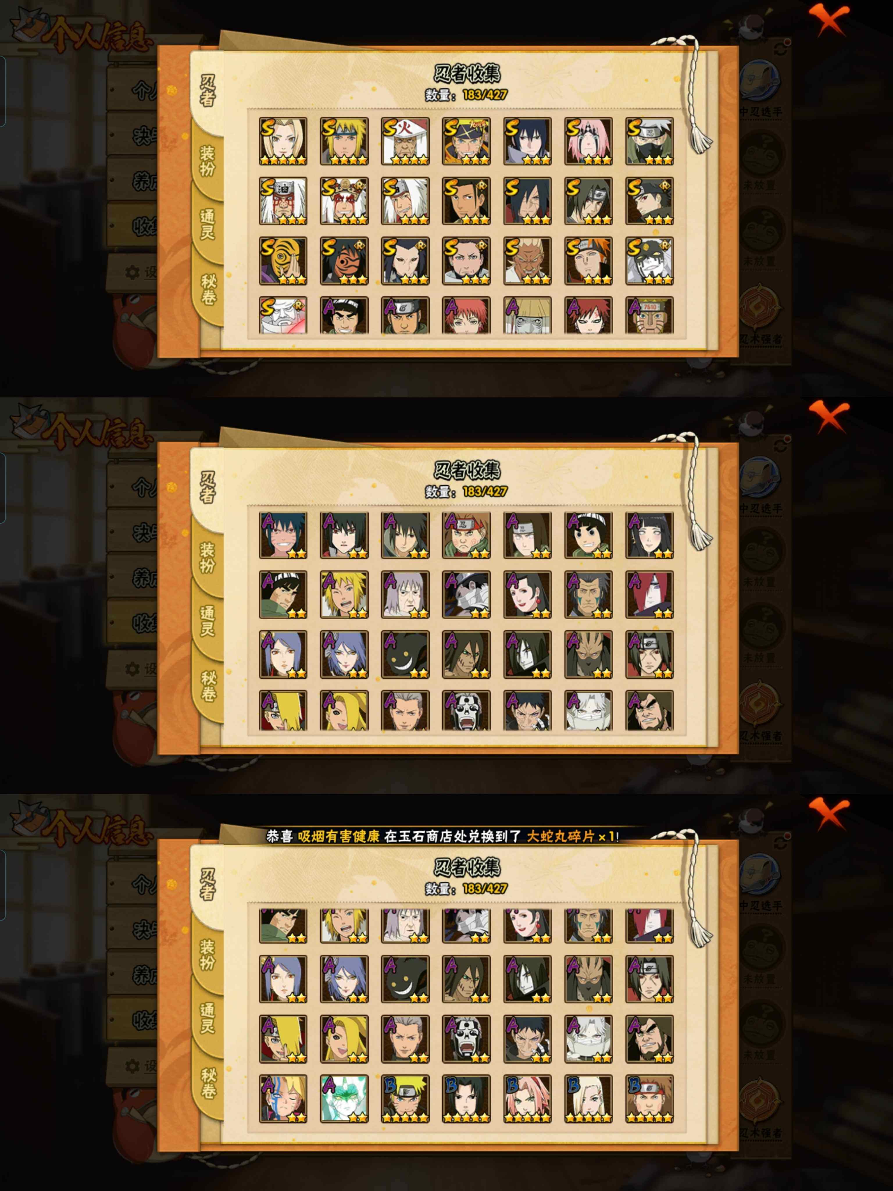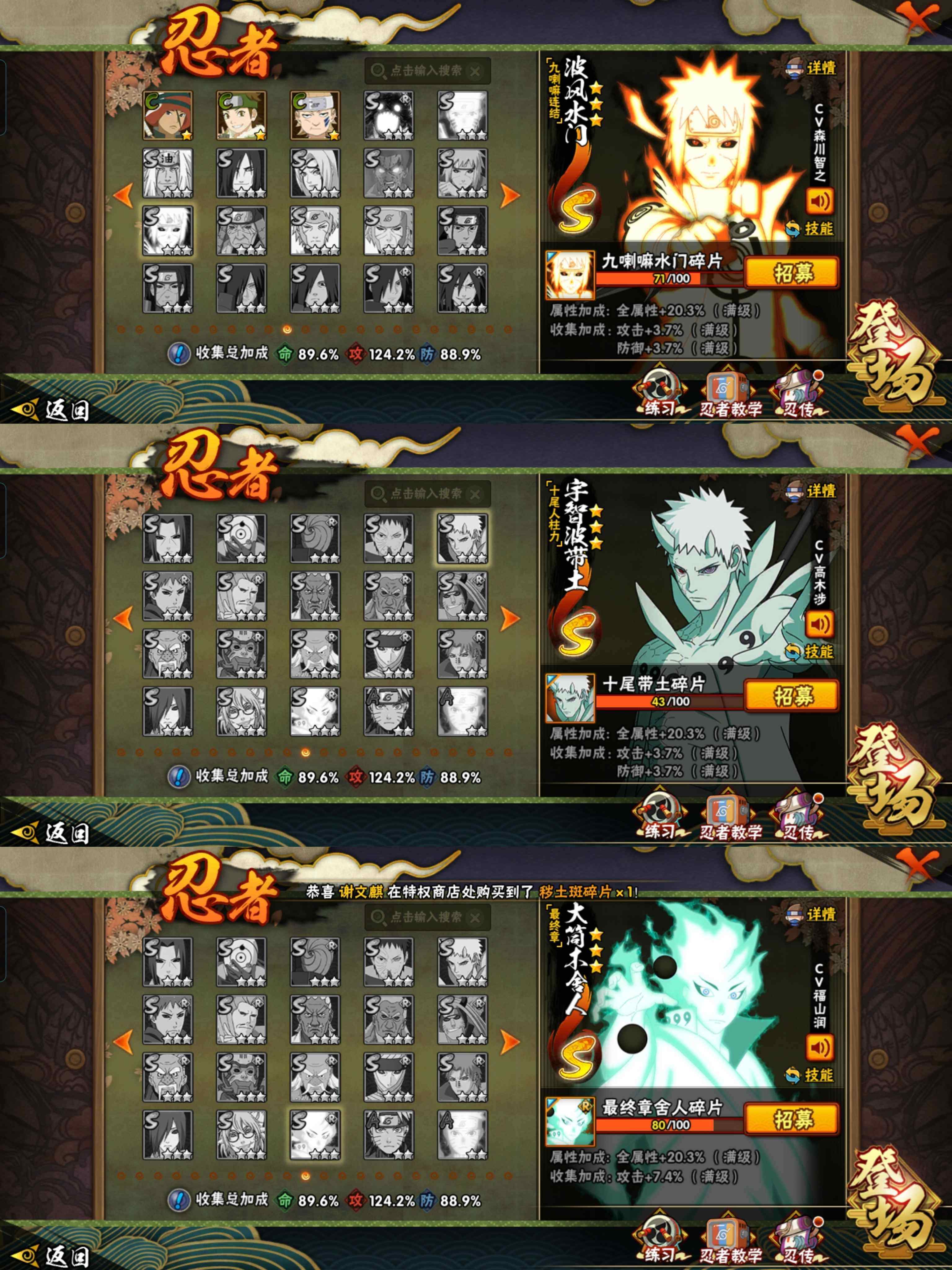 p67,1234万战,22s忍36a忍,漂泊带土三代目风影烈斗传说自来也秽土解斑忍战樱红夜面具男,烈斗「初代目风影」(3星),纲手(3星),波风水门(3星),猿飞日斩(3星),漩涡鸣人·宇智波佐助(3星),宇智波佐助「永恒万花筒」(3星),春野樱「忍界大战」(3星),旗木卡卡西「须佐能乎」(3星),自来也「仙人模式」(3星),自来也「舞之豪杰」(3星),自来也「传说中的三忍」(3星),千手柱间「