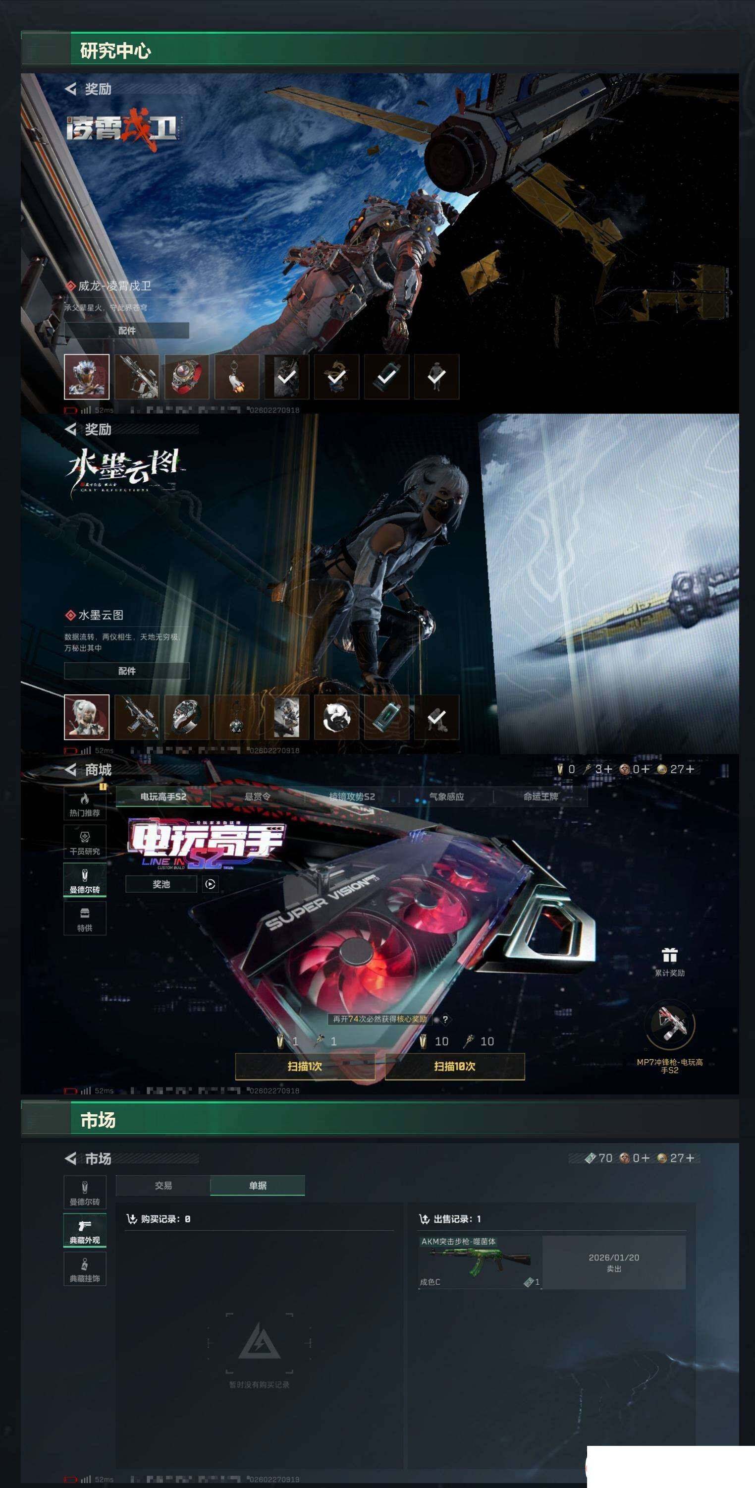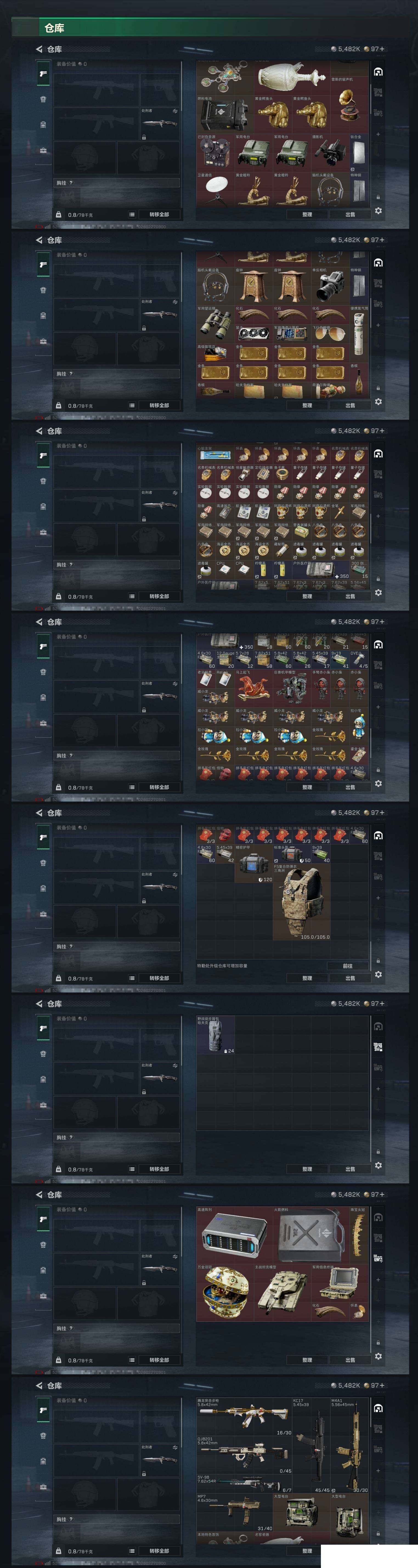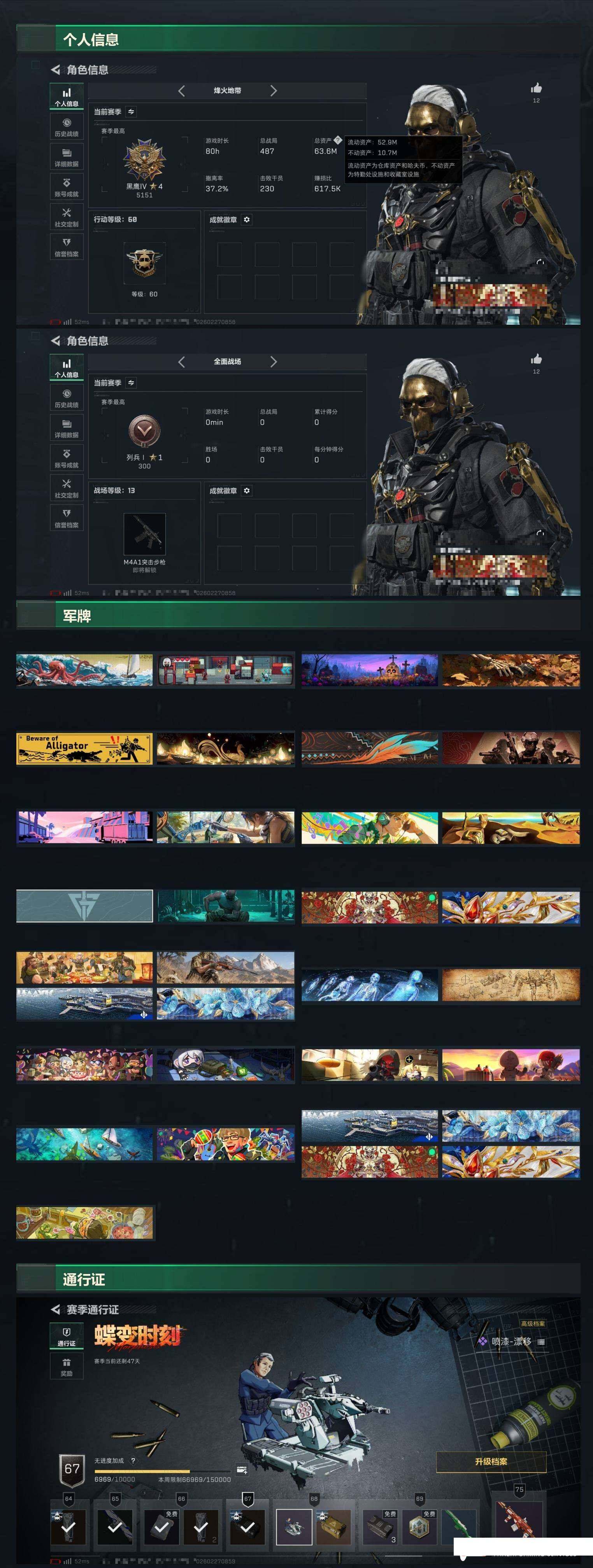 【sjs8771】总资产64m 等级60 特勤体力6负重4 蚀金玫瑰 维什戴尔 处刑者 烽火地带段位: 黑鹰 全面战场段位: 列兵 总资产: 63000000 哈夫币: 5482000 sjs8771 干员外观: 红狼-蚀金玫瑰,骇爪-维什戴尔 传说武器皮肤: M4A1突击步枪-蚀金玫瑰,R93狙击步枪-维什戴尔,SCAR-H战斗步枪-启航,MK47突击步枪-暗星,近战-处刑者,M14射手步枪-蛮荒,勇士冲锋枪-万金泪冠,腾龙突击步枪-万金泪冠,AWM狙击步枪-万金泪冠,.357左轮-缄花,SR