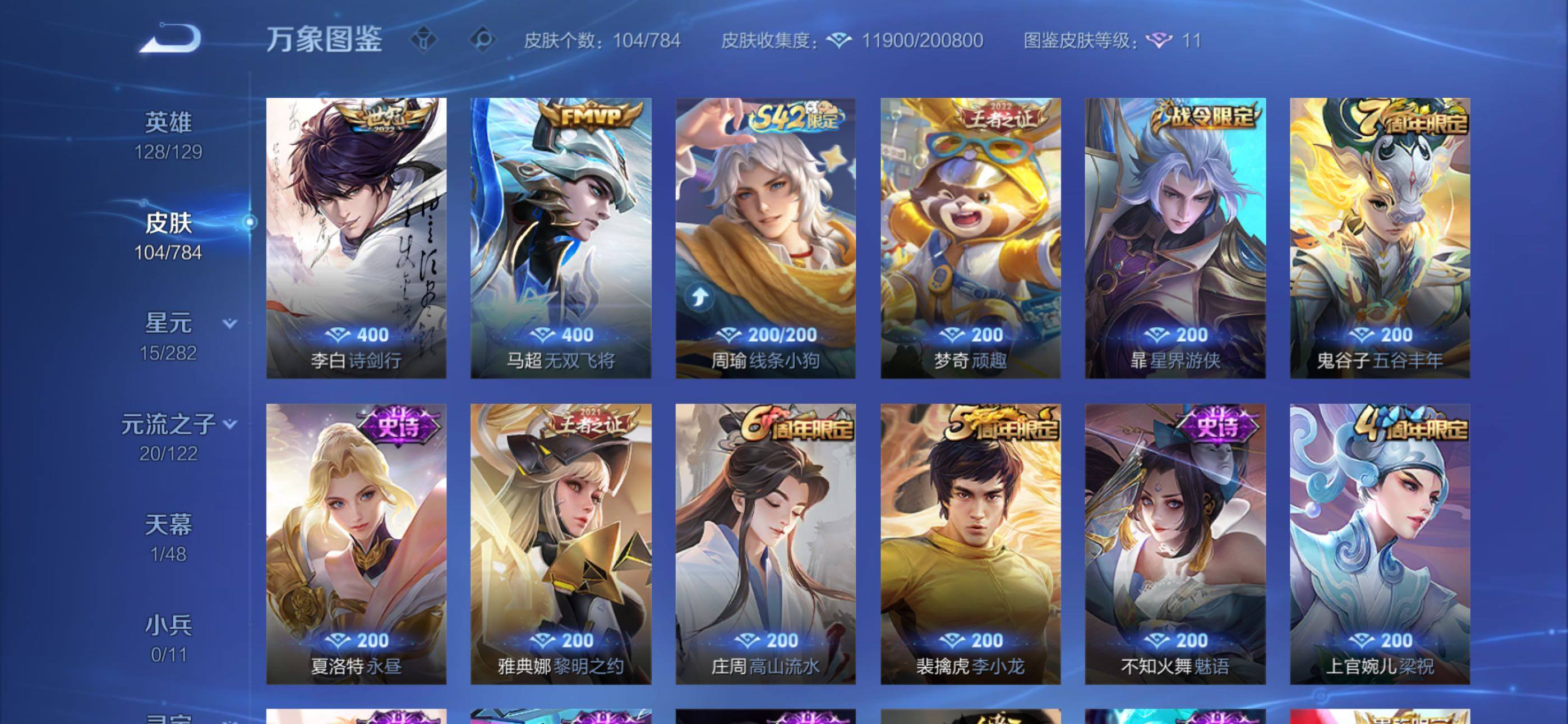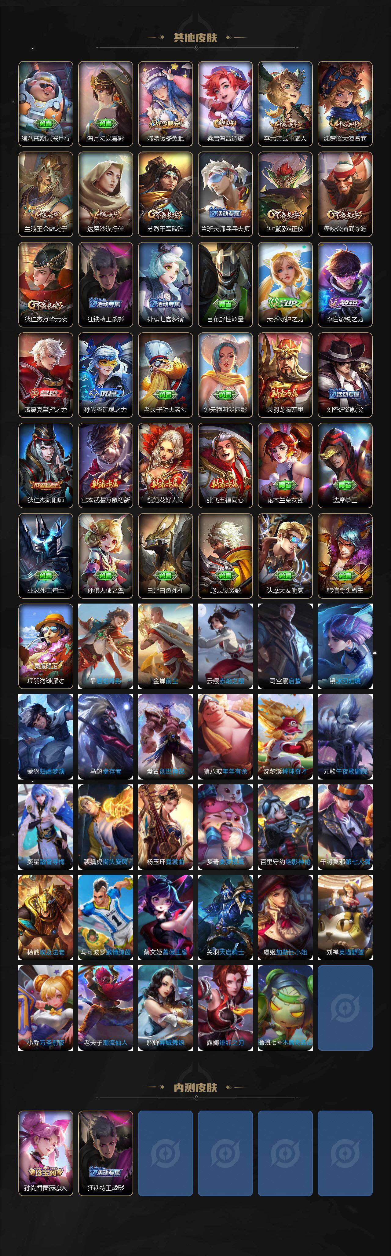【限定皮肤】:狄仁杰阴阳师,赵云皇家上将,孙尚香蔷薇恋人,庄周高山流水,狄仁杰万华元夜,达摩沙漠行僧,项羽海滩派对,程咬金演武夺筹,兰陵王金庭之子,李元芳云中旅人,钟馗驱傩正仪,雅典娜黎明之约,鬼谷子五谷丰年,苏烈千军破阵