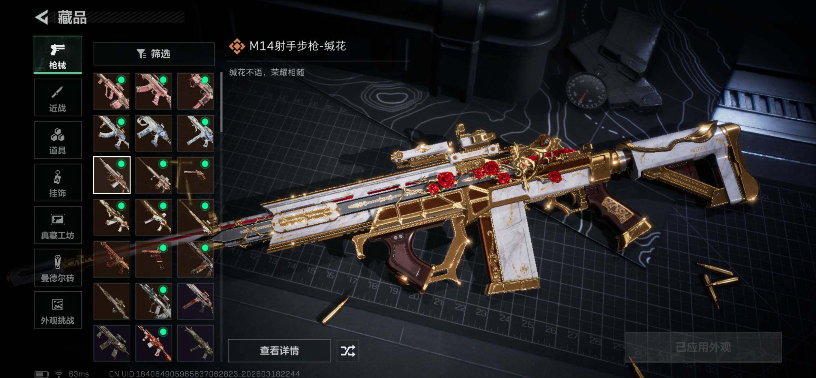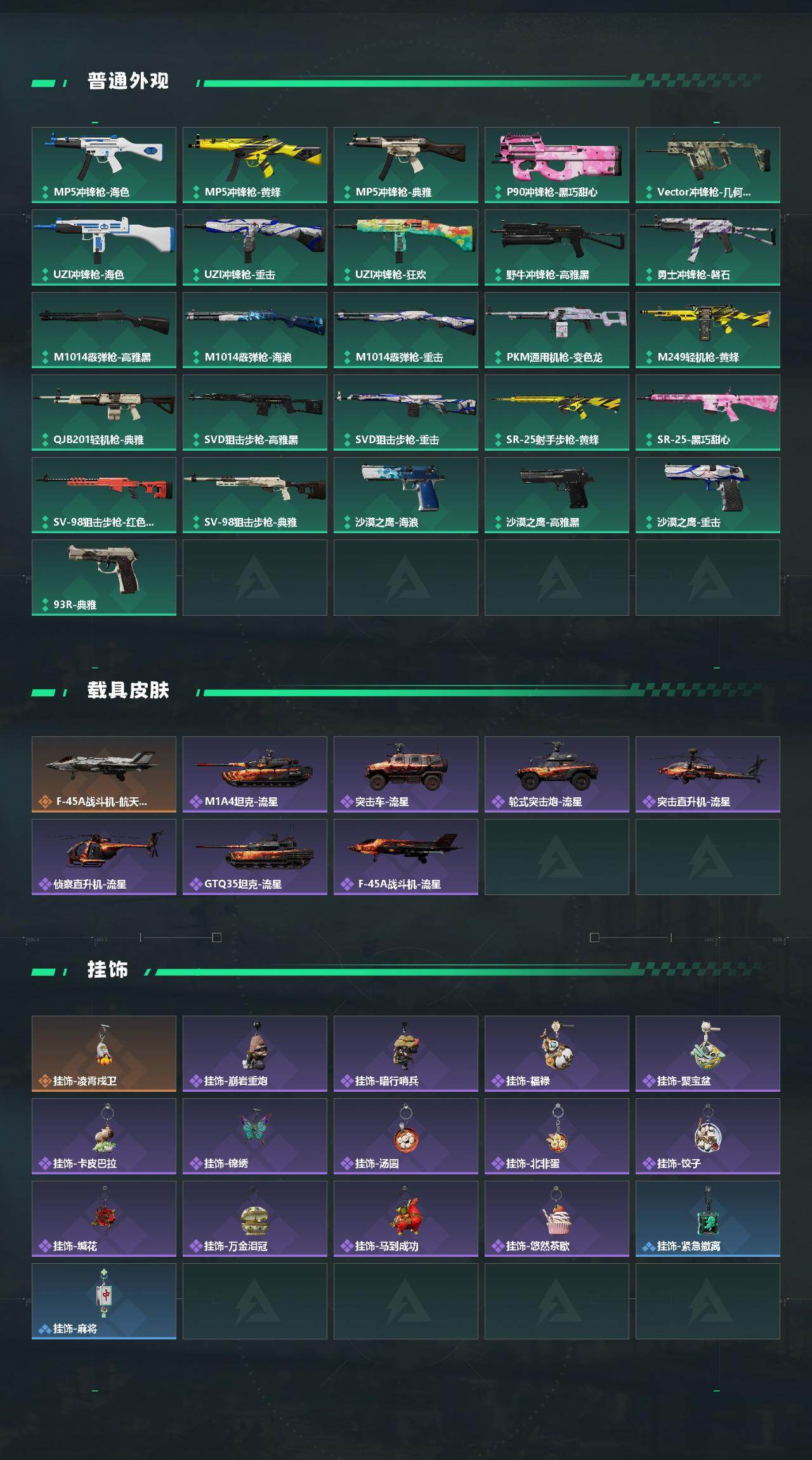 【传说外观】:AKM突击步枪-锦绣,QBZ95-1突击步枪-凌霄戍卫,K416突击步枪-行动记录,AUG突击步枪-悠然茶歇,腾龙突击步枪-马年祥瑞,腾龙突击步枪-万金泪冠,K437突击步枪-锦绣,MK47突击步枪-悠然茶歇,UZI冲锋枪-悠然茶歇,SMG-45冲锋枪-锦绣,勇士冲锋枪-万金泪冠,M14射手步枪-蛮荒