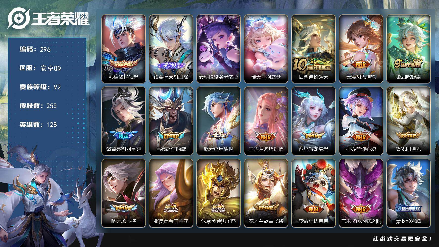 V2-最强王者段位-128英雄-255皮肤-1典藏皮肤-1无双-2珍品传说-16传说-69史诗