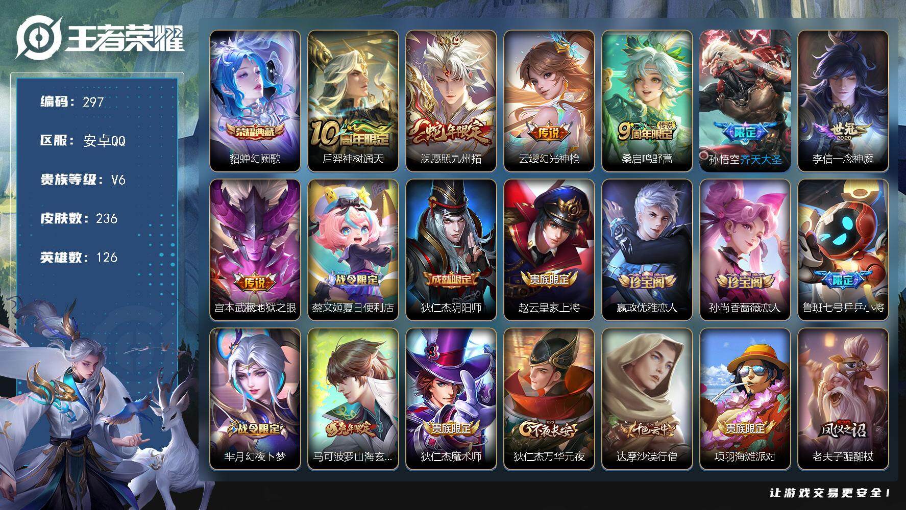 【编号53682 可秒换绑】【店长推荐王者极品小号,带有貂蝉的荣耀典藏,澜的蛇年限定,猴子的齐天大圣,马克的兔年限定等一系列热门皮肤】 安卓Q-V6-最强王者段位-126英雄-236皮肤-1典藏皮肤-7传说-56史诗【英雄全皮】:孙权全皮,影全皮【荣耀典藏】:貂蝉幻阙歌【传说皮肤】:后羿神树通天,澜愿照九州拓,云缨幻光神枪,桑启鸣野蒿,孙悟空齐天大圣,李信一念神魔,宫本武藏地狱之眼【限定皮肤】:蔡文姬夏日便利店,狄仁杰阴阳师,赵云皇家上将,嬴政优雅恋人,孙尚香蔷薇恋人,鲁班七号乒乒小将,芈月幻夜