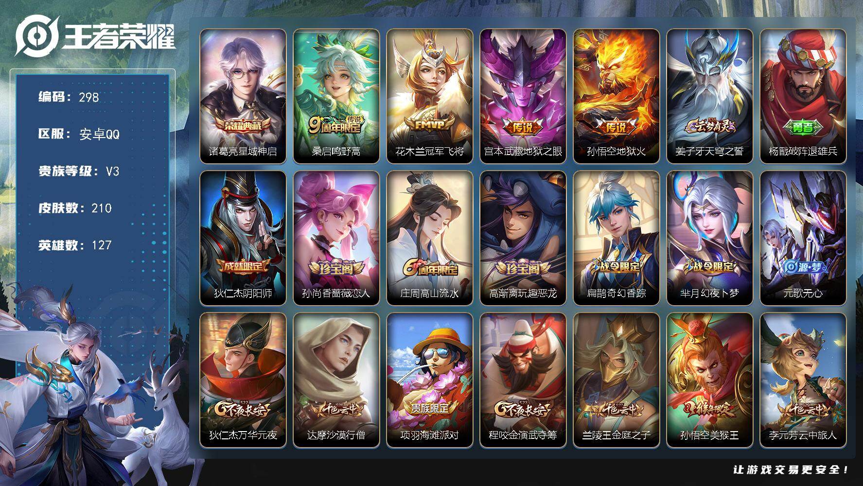 【编号76113可秒换绑】【店长推荐!极品小号诸葛荣耀典藏宫本地狱之眼+星传说花木兰冠军飞将!!! 】 安卓Q-V3-最强王者段位-127英雄-210皮肤-1典藏皮肤-4传说-54史诗【英雄全皮】:蒙恬全皮【荣耀典藏】:诸葛亮星域神启【传说皮肤】:桑启鸣野蒿,花木兰冠军飞将,宫本武藏地狱之眼,孙悟空地狱火【限定皮肤】:姜子牙天穹之誓,杨戬破阵退雄兵,狄仁杰阴阳师,孙尚香蔷薇恋人,庄周高山流水,高渐离玩趣恶龙,扁鹊奇幻香踪,芈月幻夜卜梦,元歌无心,狄仁杰万华元夜,达摩沙漠行僧,项羽海滩派对,程咬金