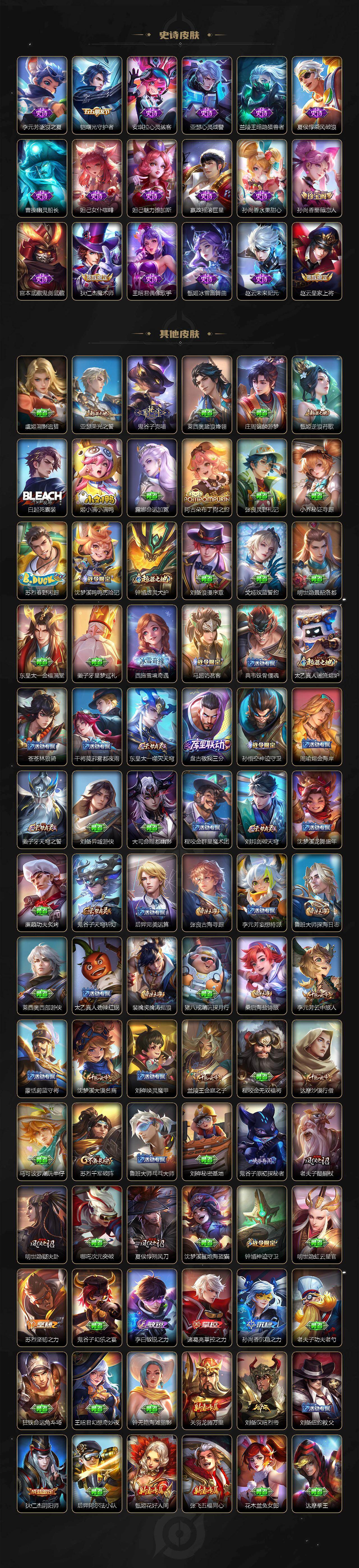 【限定皮肤】:姜子牙天穹之誓,狄仁杰阴阳师,赵云皇家上将,墨子降魔,孙尚香蔷薇恋人,鲁班七号狮舞东方,元歌无心,夏侯惇朔风刀,马可波罗山海玄木