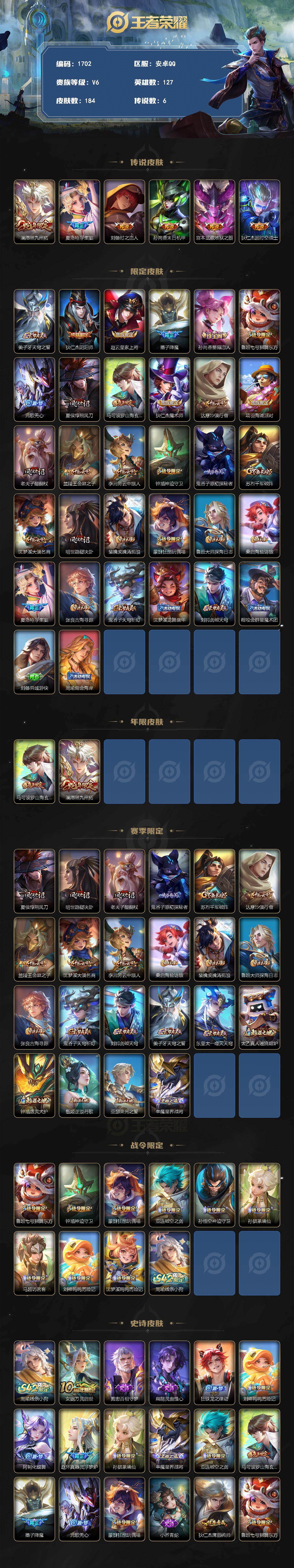 【澜愿照九州拓 刘备时之恋人 夏洛特浮生妄】安卓Q-V6-至尊星耀V段位-127英雄-184皮肤-6传说-35史诗