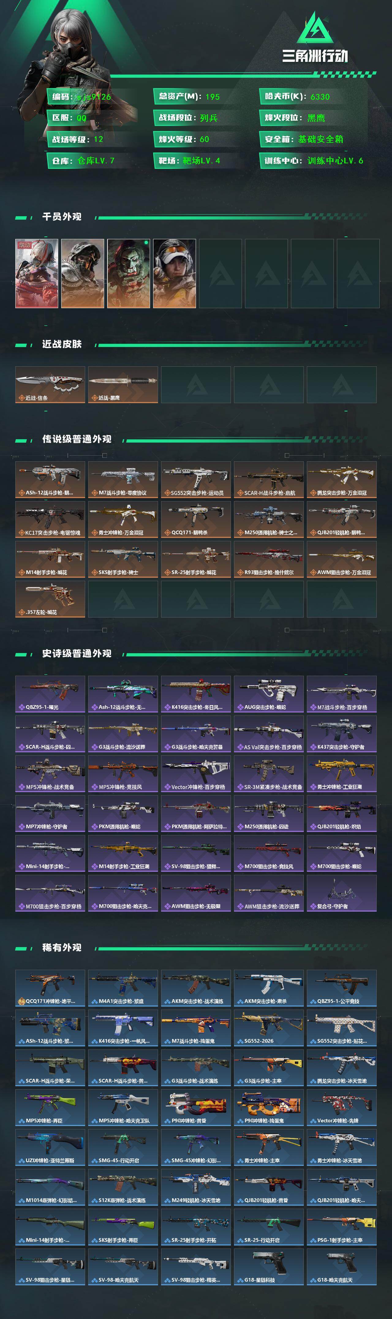 【sjs9126】总资产195m 等级60 137发aw 42个咖啡豆 特勤体力6负重4 维什戴尔 信条捆绑包 电锯惊魂 金牌射手 sjs9126 烽火地带段位: 黑鹰 全面战场段位: 列兵 总资产: 195000000 哈夫币: 6330000 干员外观: 深蓝-不破誓约(S6),骇爪-维什戴尔,红狼-电锯惊魂,露娜-金牌射手(S7) 传说武器皮肤: M7战斗步枪-零度协议,M250通用机枪-骑士之心,R93狙击步枪-维什戴尔,SCAR-H战斗步枪-启航,ASh-12战斗步枪-鹅鸭杀,QCQ1