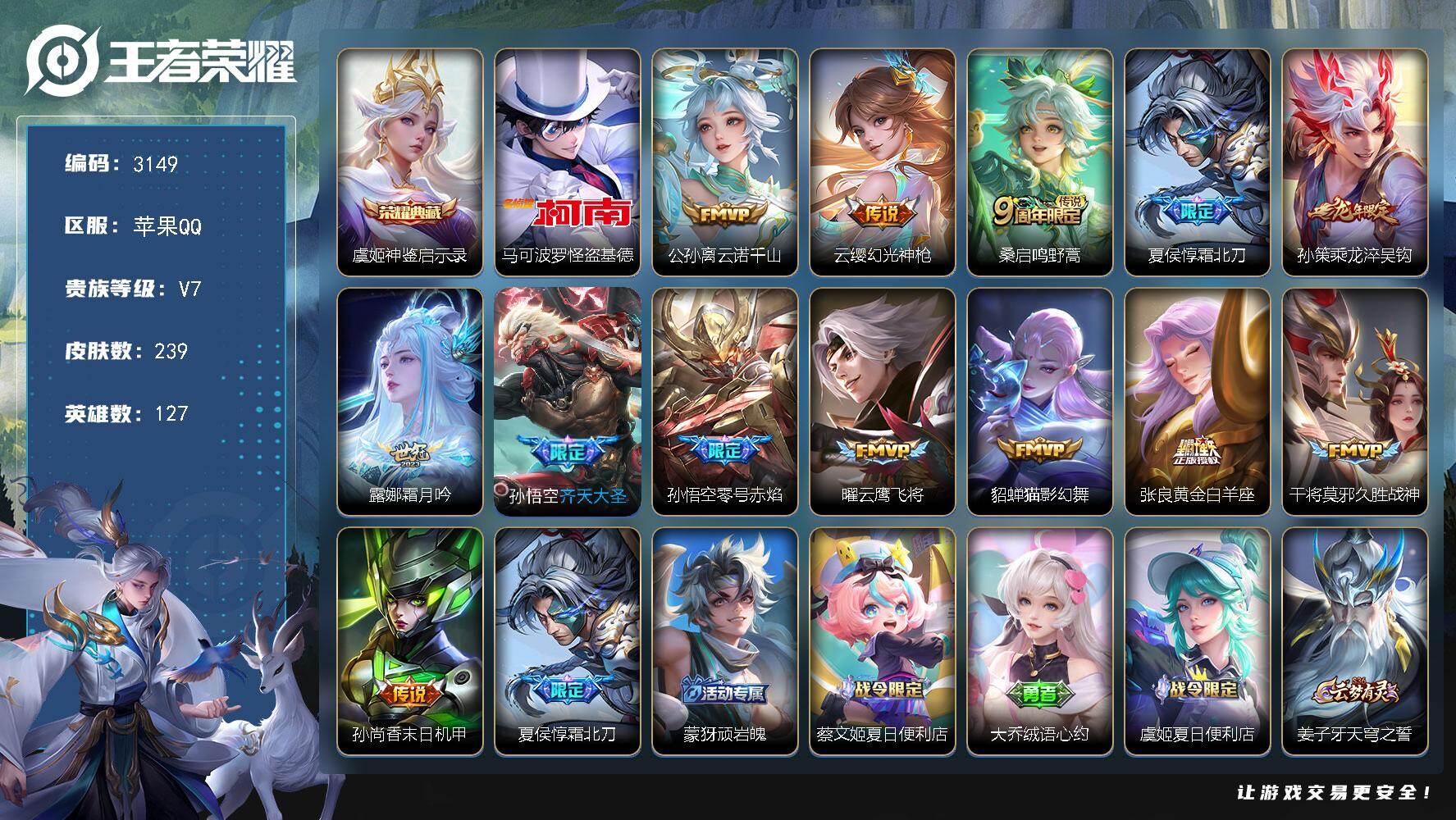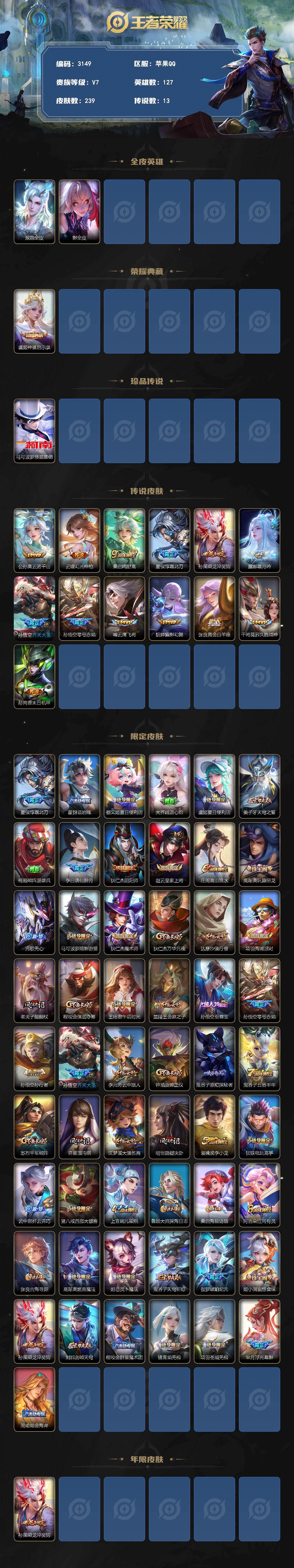【特价V7极品射手号·虞姬典藏·马可珍品·公孙离云诺千山·夏侯惇霜北刀·孙策乘龙淬吴钩·貂蝉猫影幻舞·至尊宝·皮肤多限定多】苹果Q-V7-尊贵铂金I段位-127英雄-239皮肤-1典藏皮肤-1珍品传说-13传说-66史诗