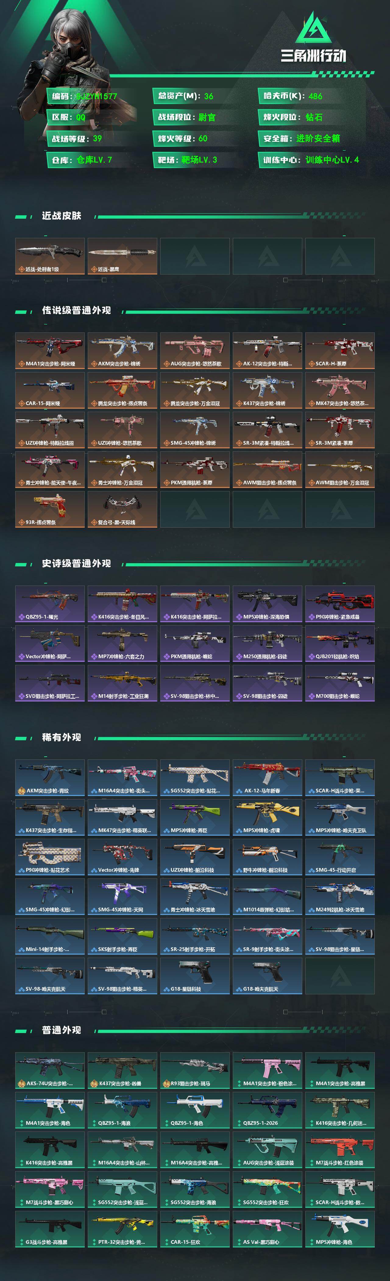 【SJZYH1577】总资产(M):36M/哈夫币(K):486K/哈夫币(K):486K/传说枪皮数:22/全面战场等级:39_段位:尉官/烽火地带等级:60_段位:钻石/近战-处刑者1级/近战-黑鹰/M4A1突击步枪-阿米娅/AKM突击步枪-锦绣/AUG突击步枪-悠然茶歇/AK-12突击步枪-特斯拉线圈/SCAR-H战斗步枪-荼蘼/CAR-15突击步枪-阿米娅/腾龙突击步枪-捞点薯条/腾龙突击步枪-万金泪冠/K437突击步枪-锦绣/MK47突击步枪-悠然茶歇/UZI冲锋枪-特斯拉线圈/UZI
