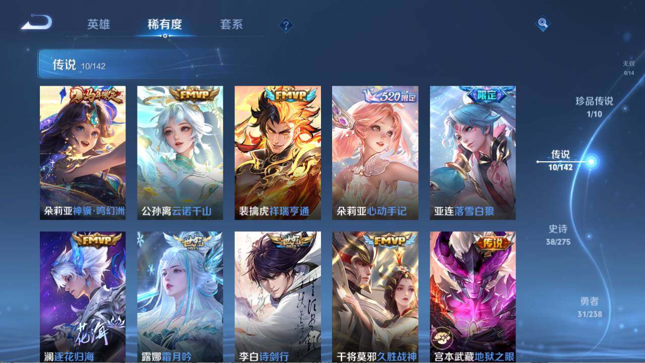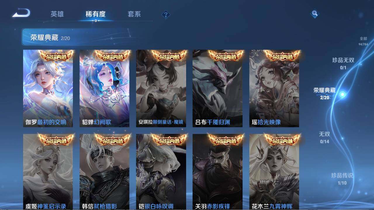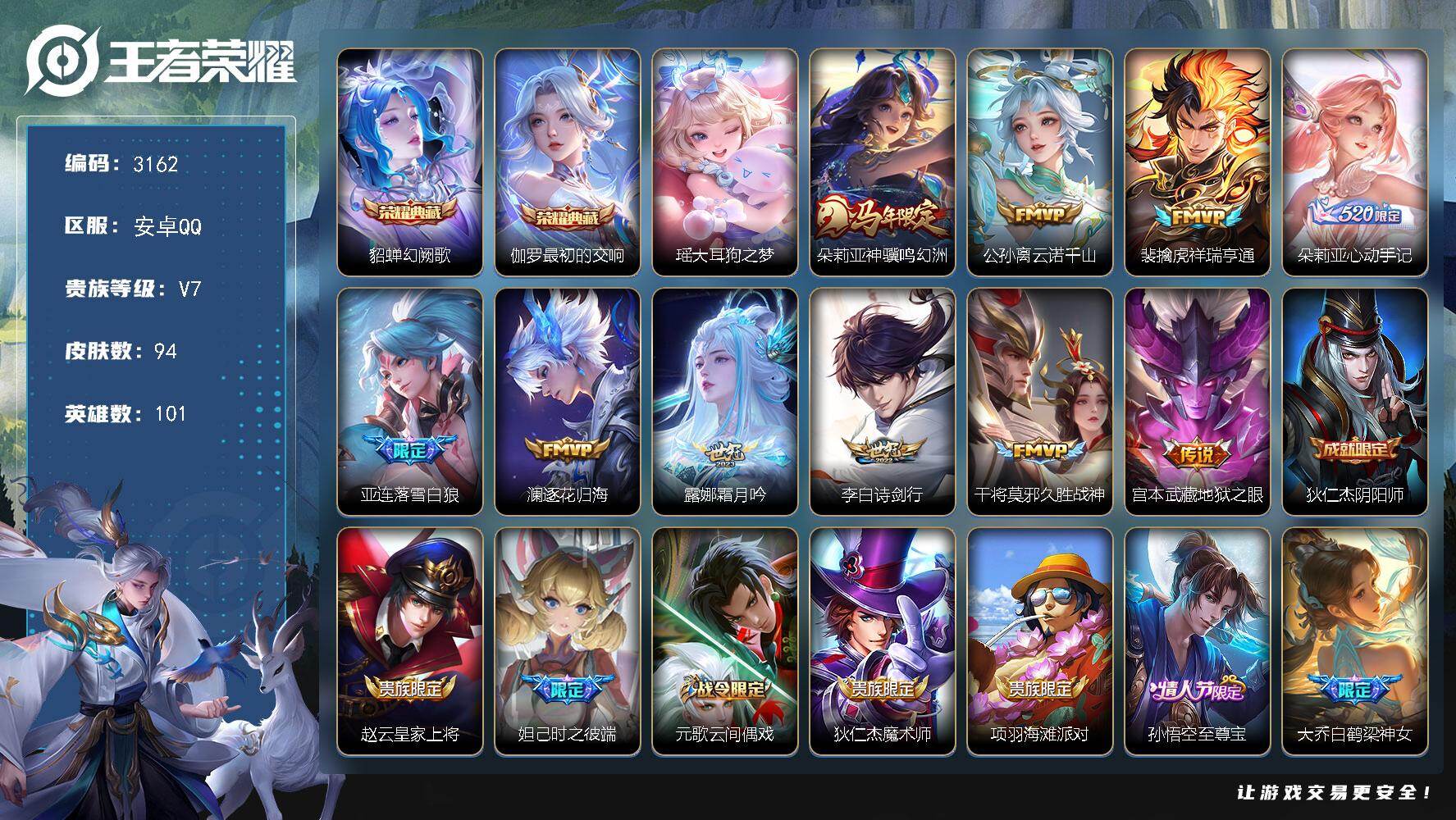 安卓Q-V7-最强王者段位-101英雄-94皮肤-2典藏皮肤-1珍品传说-10传说-37史诗