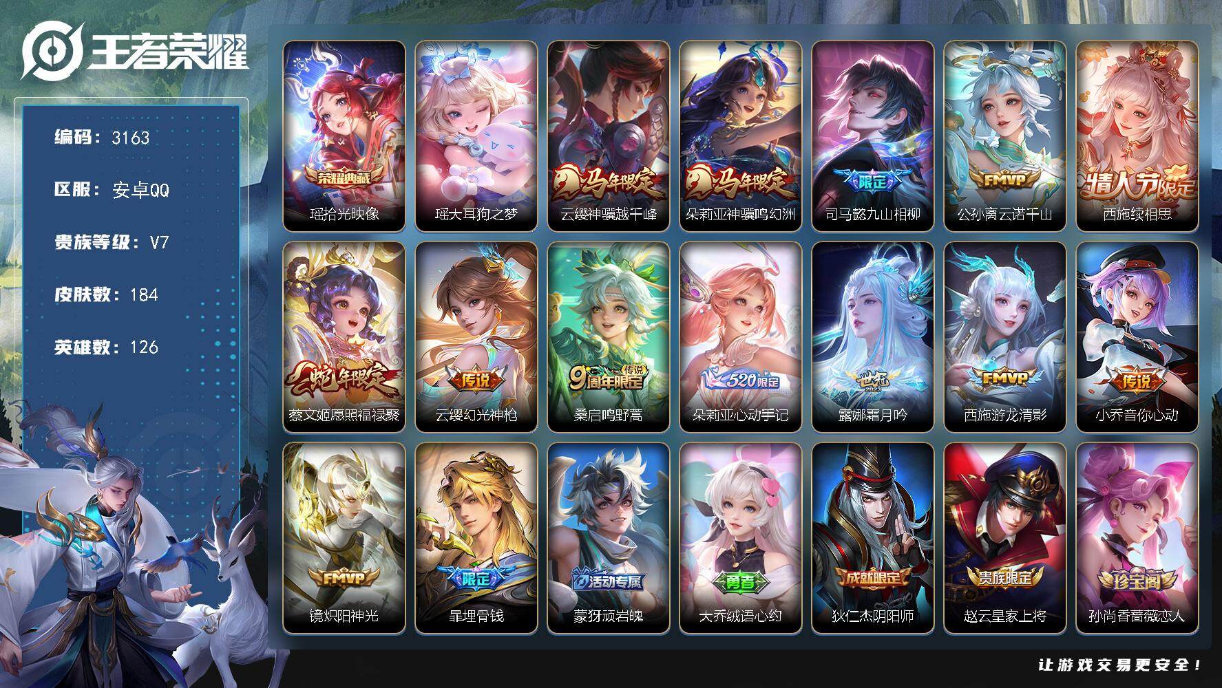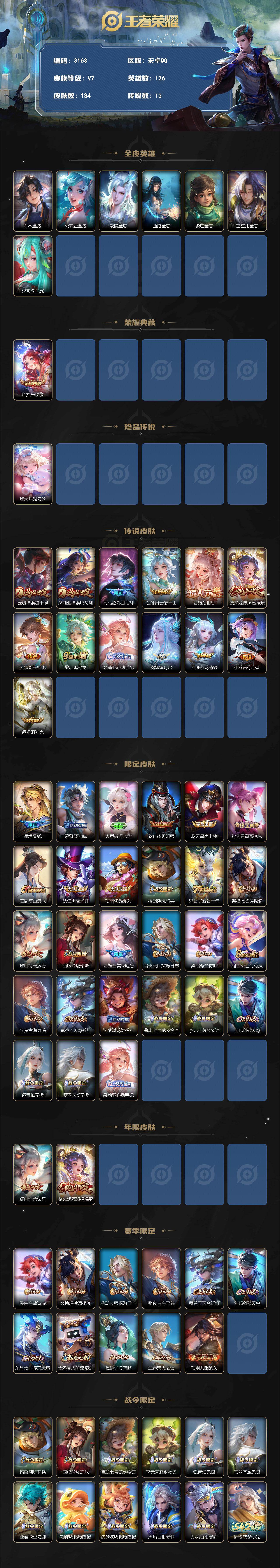 安卓Q-V7-至尊星耀II段位-126英雄-184皮肤-1典藏皮肤-1珍品传说-13传说-51史诗