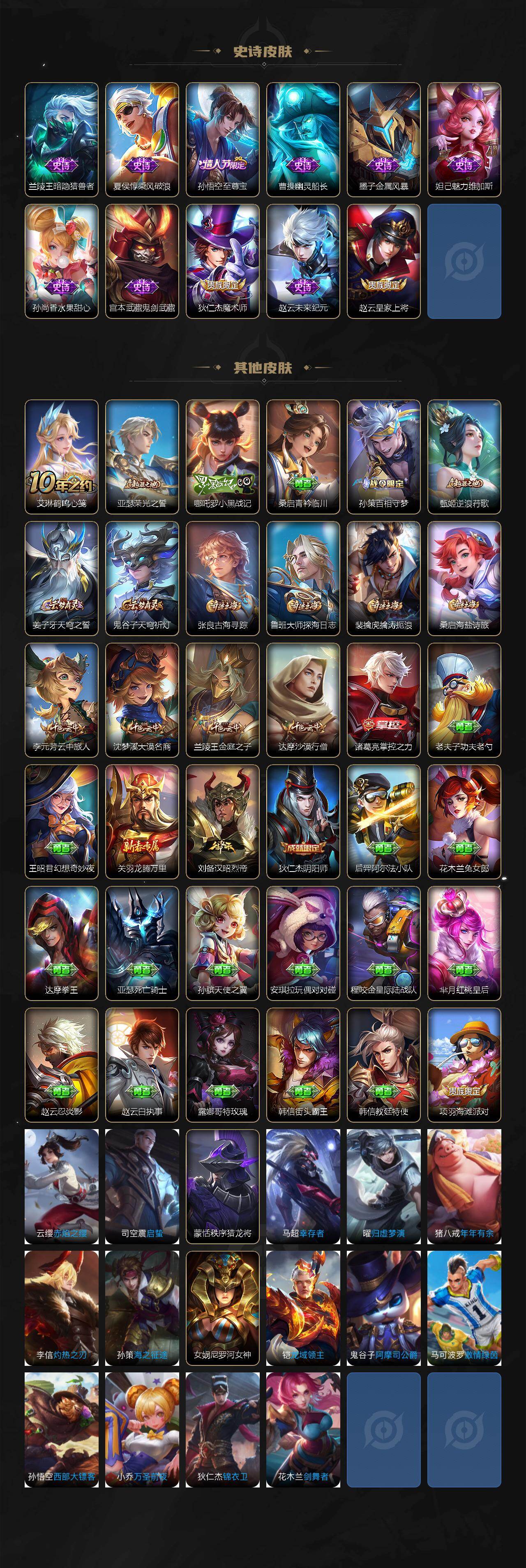 【传说皮肤】:云缨神骥越千峰,关羽神骥镇沧海,朵莉亚神骥鸣幻洲,狄仁杰神骥赴朔漠,貂蝉神骥聚万邦,马超神骥逐星野,花木兰异界灵契,曹操万灵伏威,澜逐