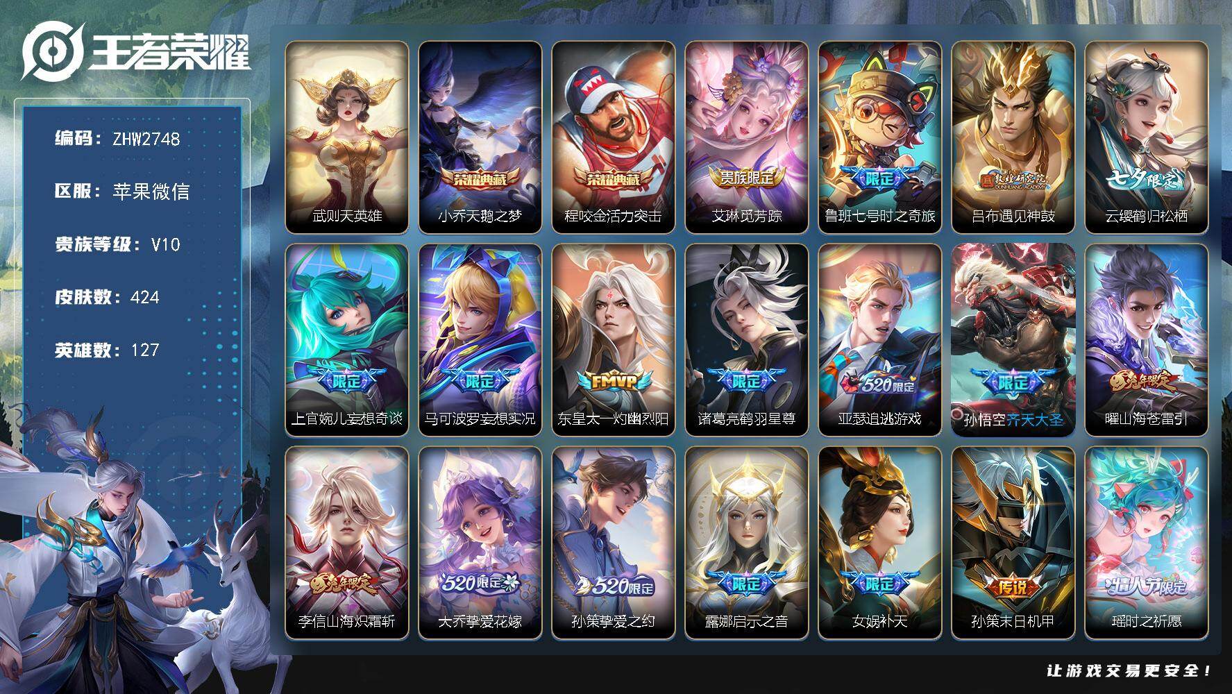 社交限制不影响游戏/介意勿拍-苹果WX-V10-最强王者段位-127英雄-424皮肤-2典藏皮肤-1典藏英雄-44传说-145史诗【英雄全皮】:猪八戒全皮,鲁班大师全皮,戈娅全皮,影全皮【荣耀典藏】:武则天英雄,小乔天鹅之梦,程咬金活力突击【传说皮肤】:艾琳觅芳踪,鲁班七号时之奇旅,吕布遇见神鼓,云缨鹤归松栖,上官婉儿妄想奇谈,马可波罗妄想实况,东皇太一灼幽烈阳,诸葛亮鹤羽星尊,亚瑟追逃游戏,孙悟空齐天大圣,曜山海苍雷引,李信山海炽霜斩,大乔挚爱花嫁,孙策挚爱之约,露娜启示之音,女娲补天,孙策末
