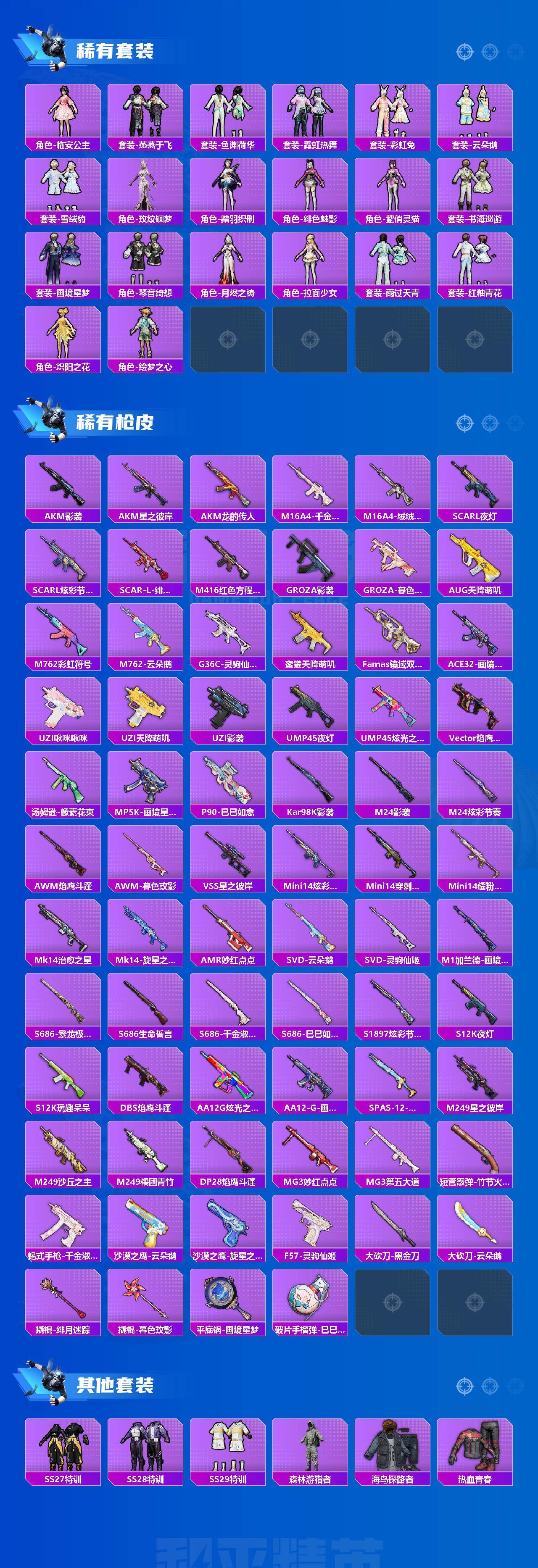 素材号-地铁满天赋-图卡盟1级/千金淑猫/AUG星之彼岸3级/深海小丑鱼/拉面少女/都市丽猫/摩登魅猫/许七安/临安公主/星之彼岸/冷漠罗丽/绯月迷踪/烬夜之誓/旋星之夜/辉光之愿/蜜獾辉耀战甲7级/ARX萌骑跃动4级/SCAR灵驹仙姬3级/AK暮色玫影3级/狗砸旋星之夜3级/暮色幽蹄/九霄玄鹿(1神装7粉装15粉枪2载具)没战神框 HP6701-12粉色飞行器-54107热力值-6王牌印记-96套装-169枪皮
