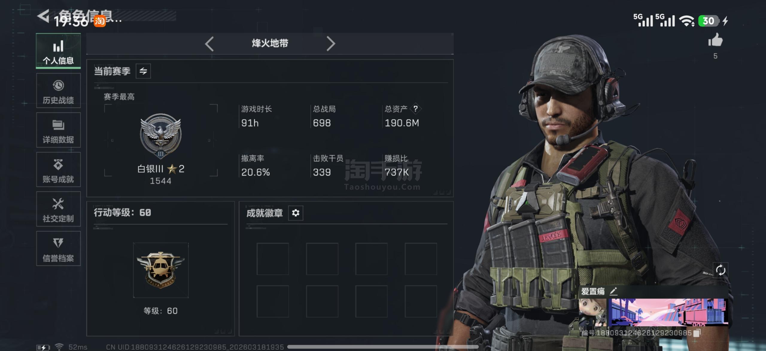 三端互通-总资产190M现金35M-4体4负-处刑者3级-赛季通行证已开-带五千三角卷可直接买刀皮-极品唐人号