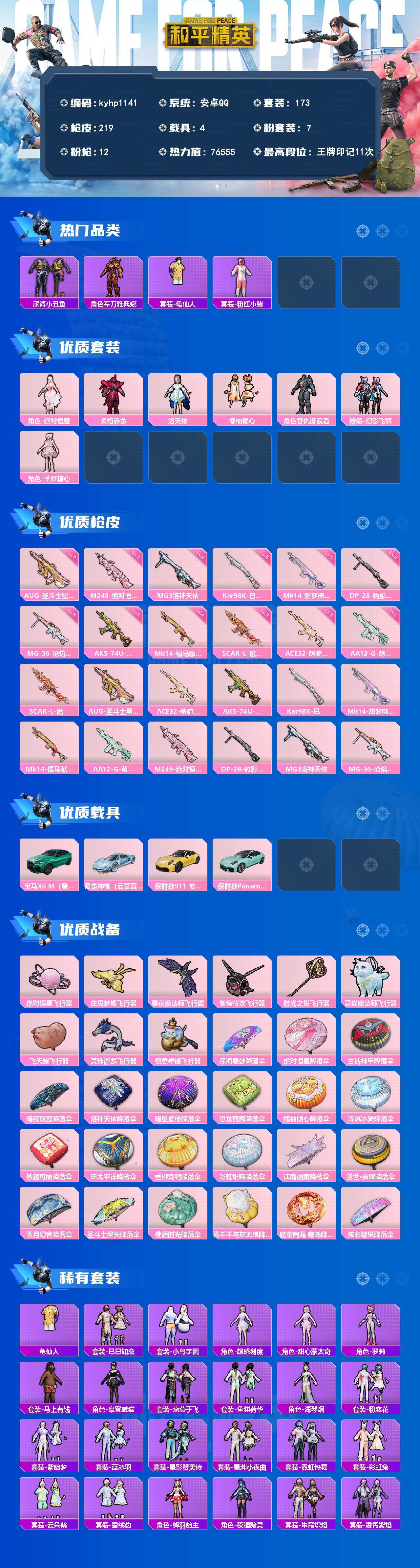 安卓 手Q-7粉装-12特效枪-4载具-9粉色飞行器-76555热力值-11王牌印记-173套装-219枪皮