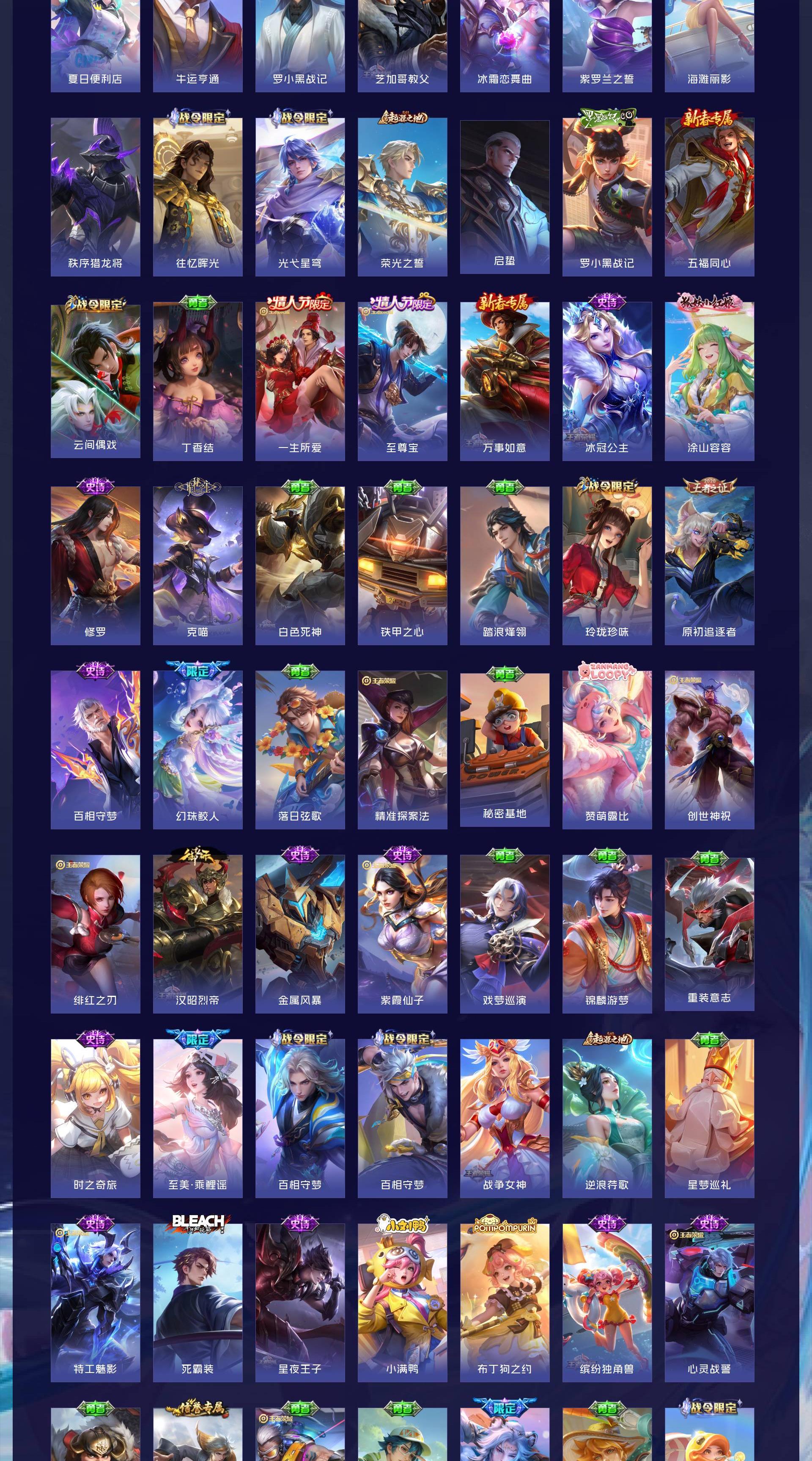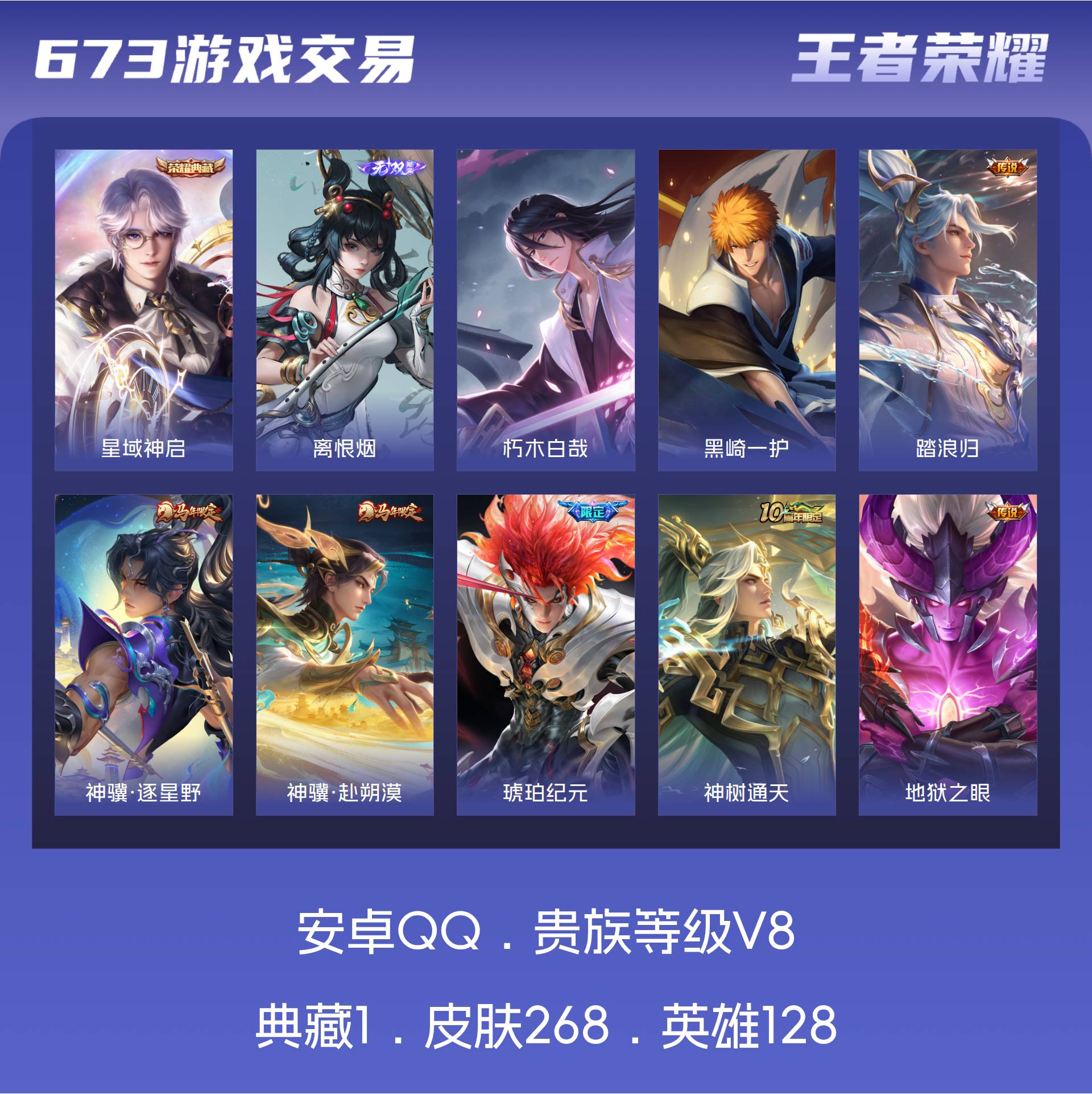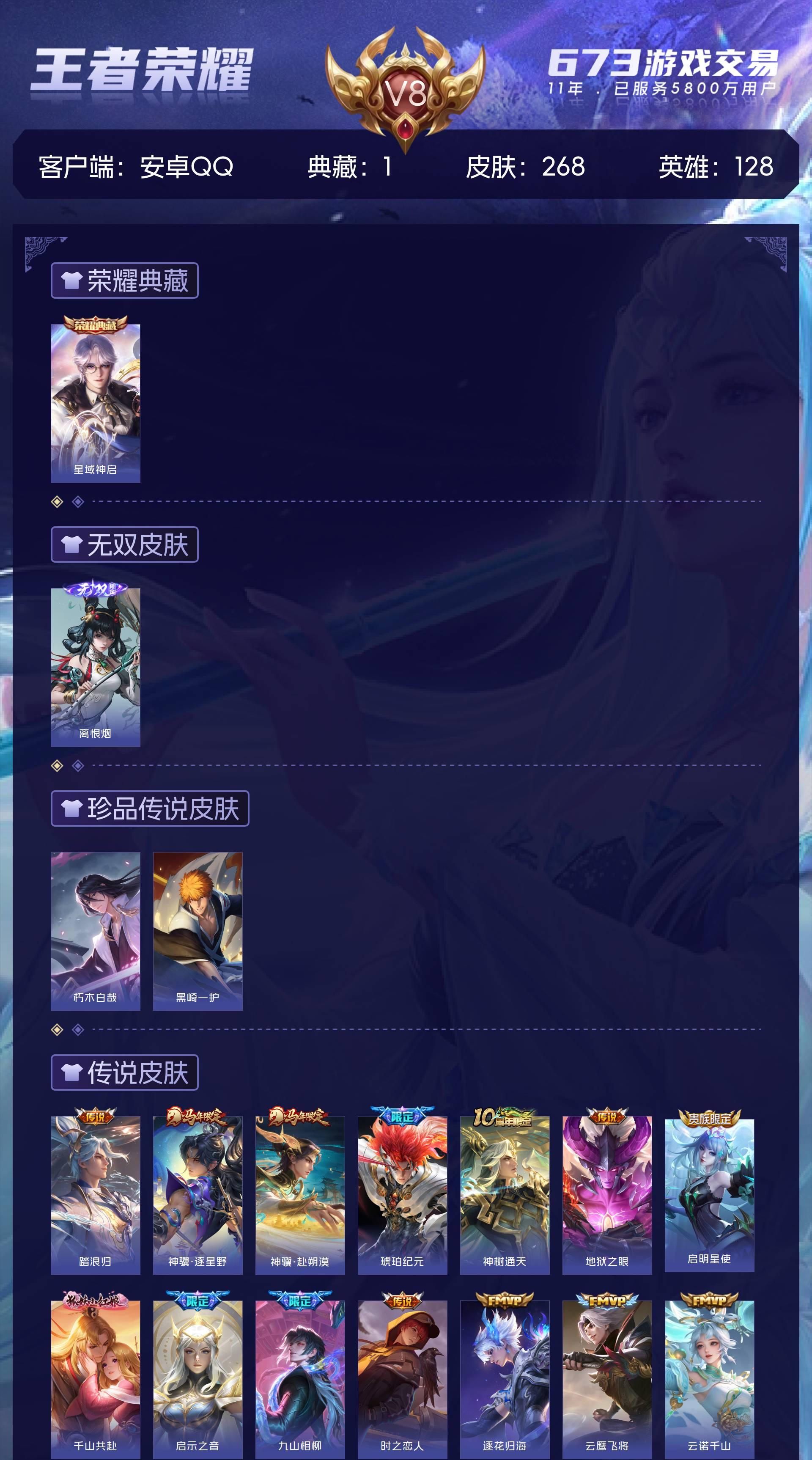 V8 皮肤268 英雄128 至圣王者 荣耀典藏1 无双皮肤1 珍品传说2 星传说3 传说22 其他皮肤248