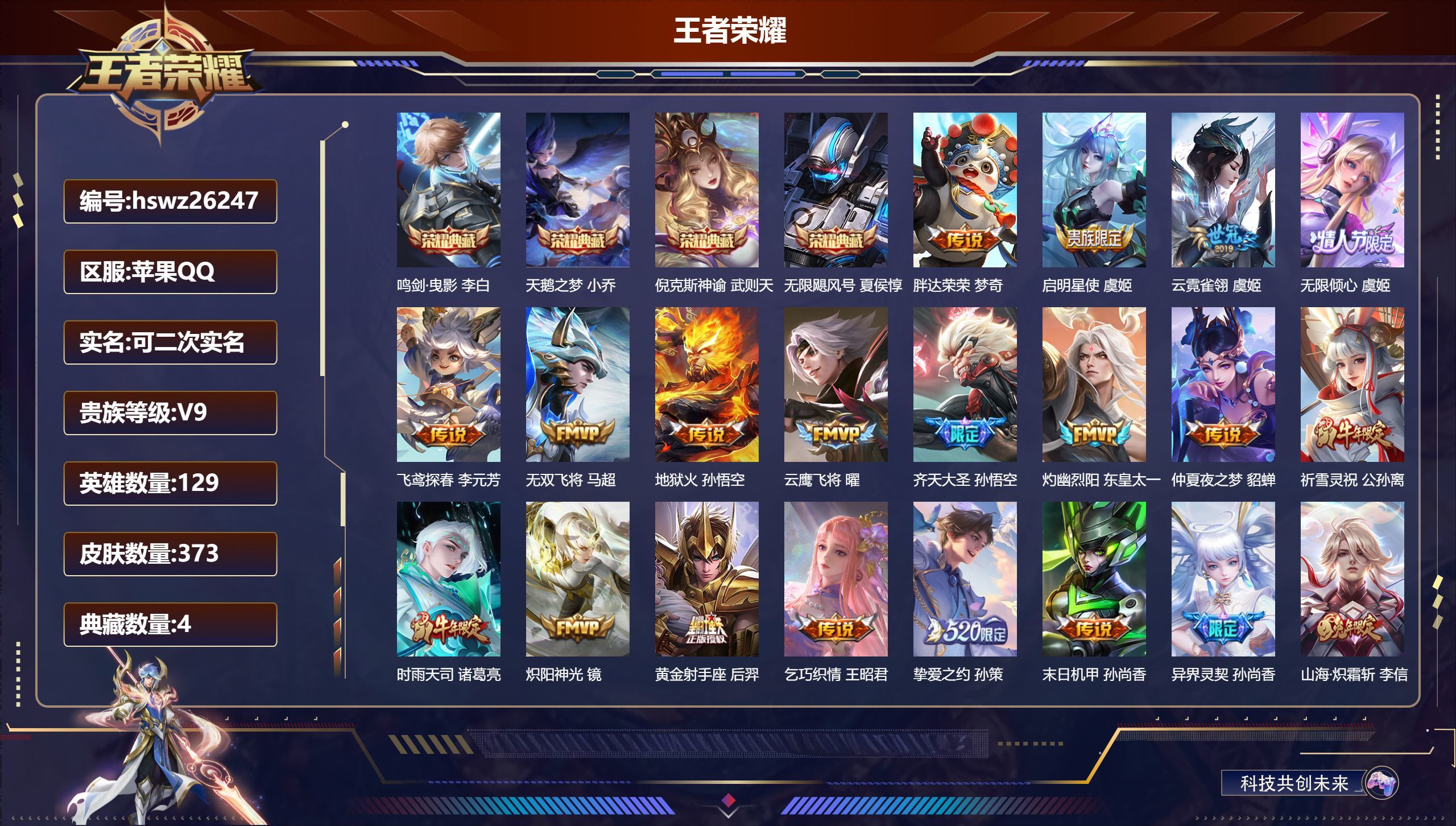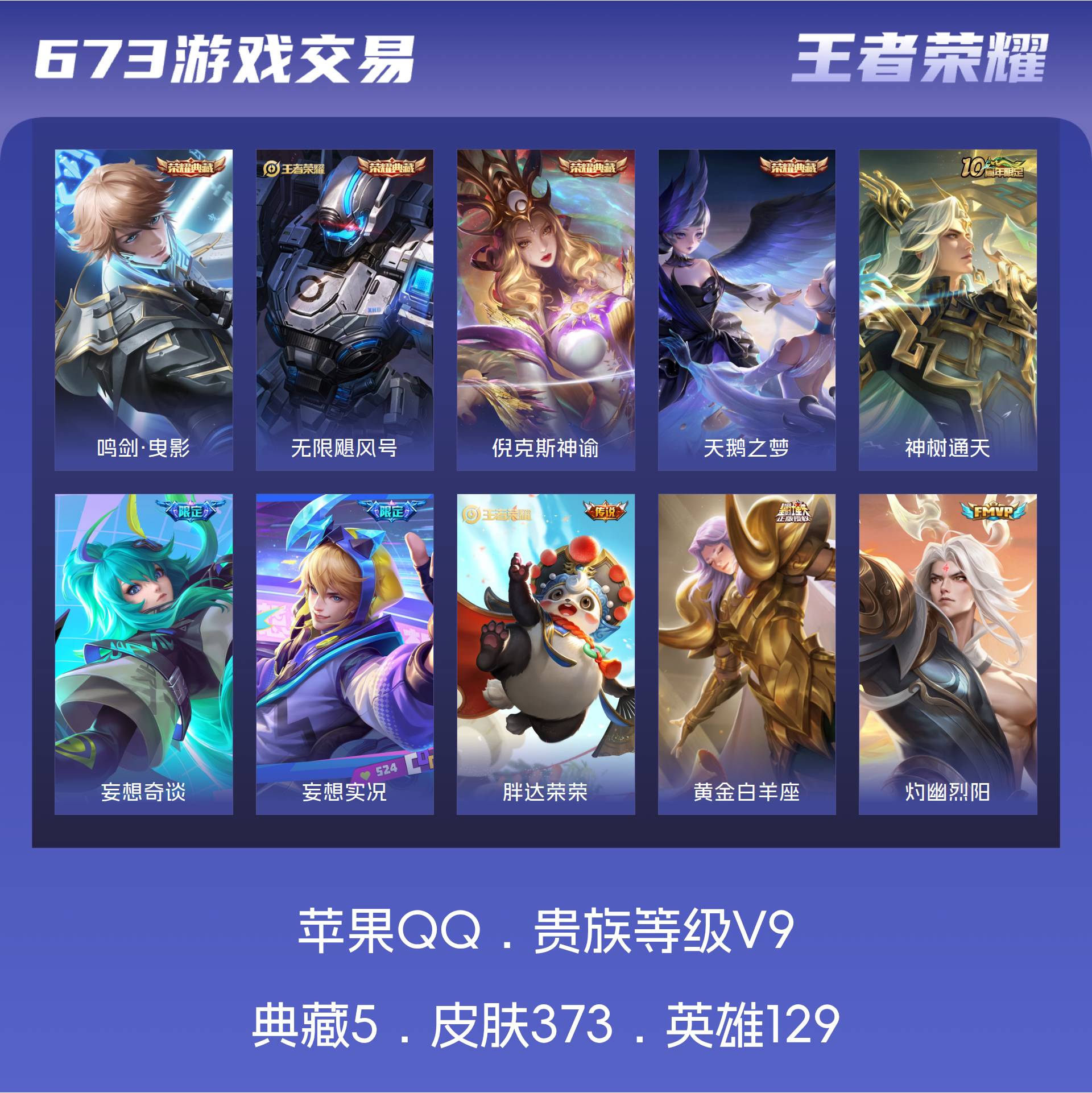 苹果QQ/永恒钻石/373皮肤/129英雄/4典藏/0珍品无双/0无双/0珍品传说/29传说/124