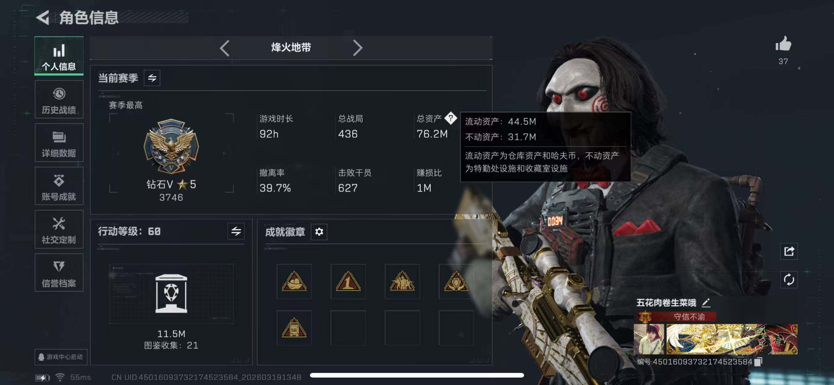 76m总资产-4027k哈夫币-60烽火等级-钻石-50战场等级-尉官【干员