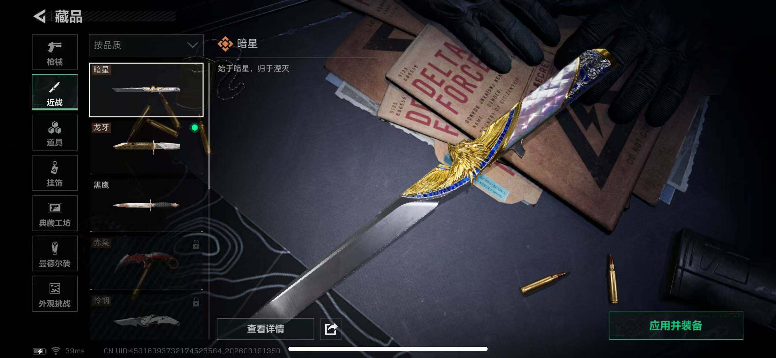 【近战皮肤】:近战-暗星,近战-龙牙,近战-黑鹰