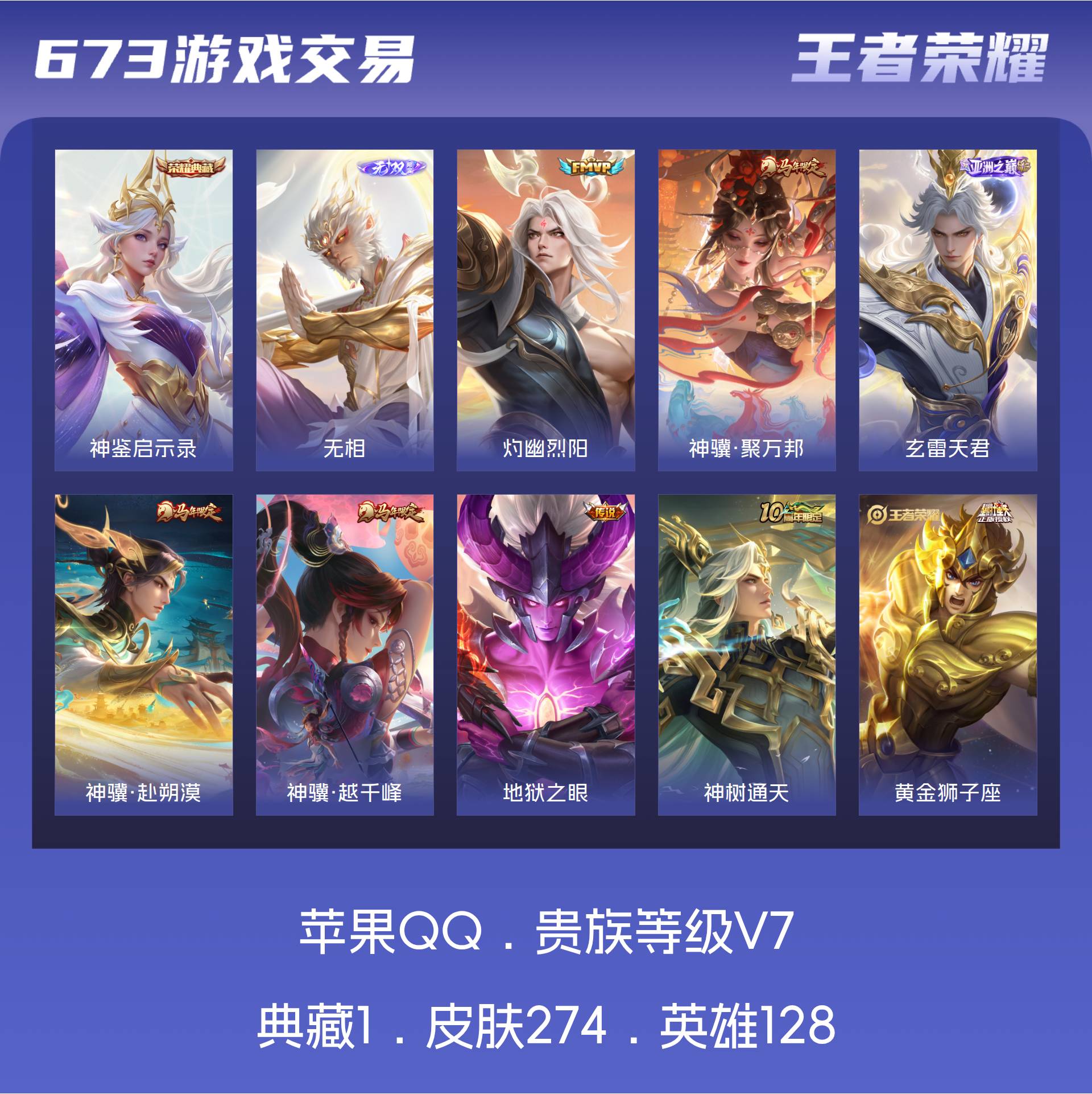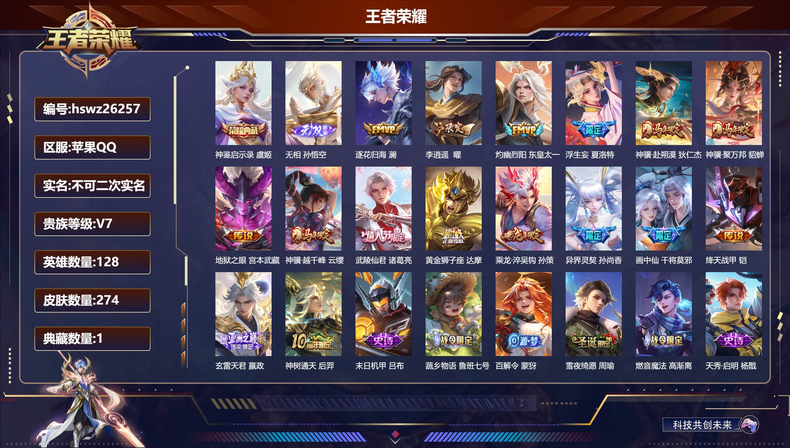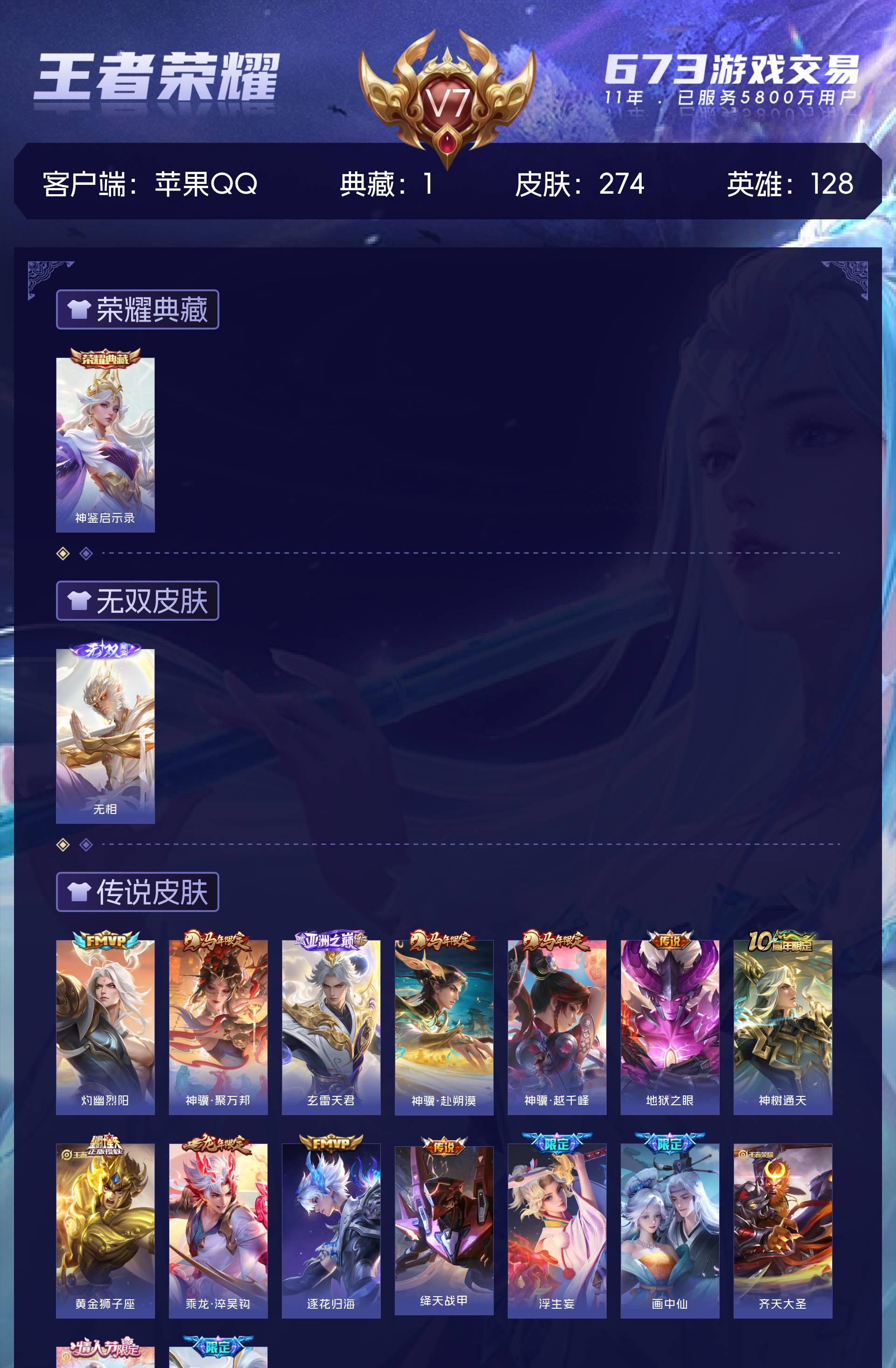 苹果QQ/荣耀王者/274皮肤/128英雄/1典藏/0珍品无双/1无双/0珍品传说/16传说/86史