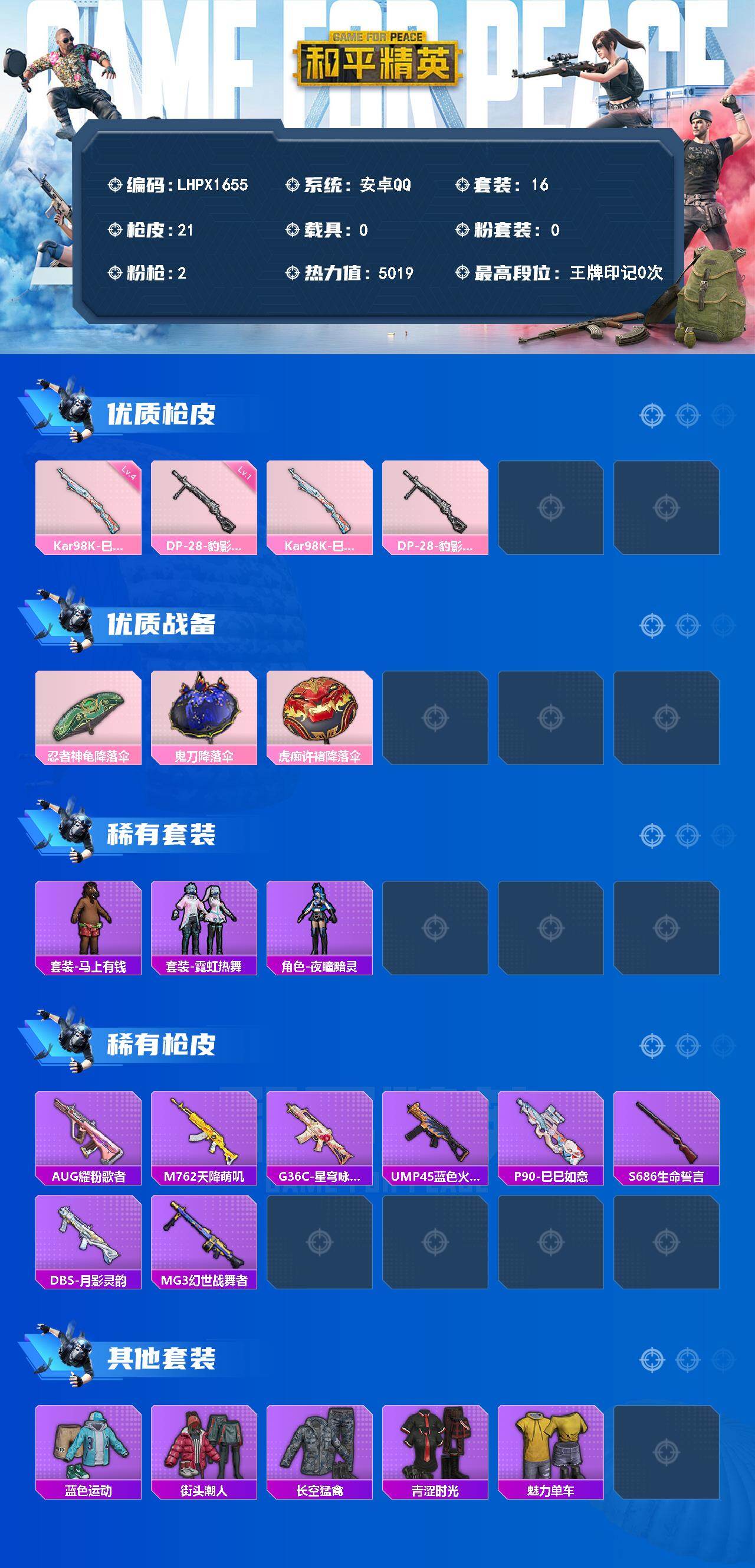 【特价出售/店主推荐】安卓 手Q-2特效枪-5019热力值-16套装-21枪皮【粉色枪皮等级】:Kar98K-巳巳如意(四级),DP-28-豹影疾电(一级)