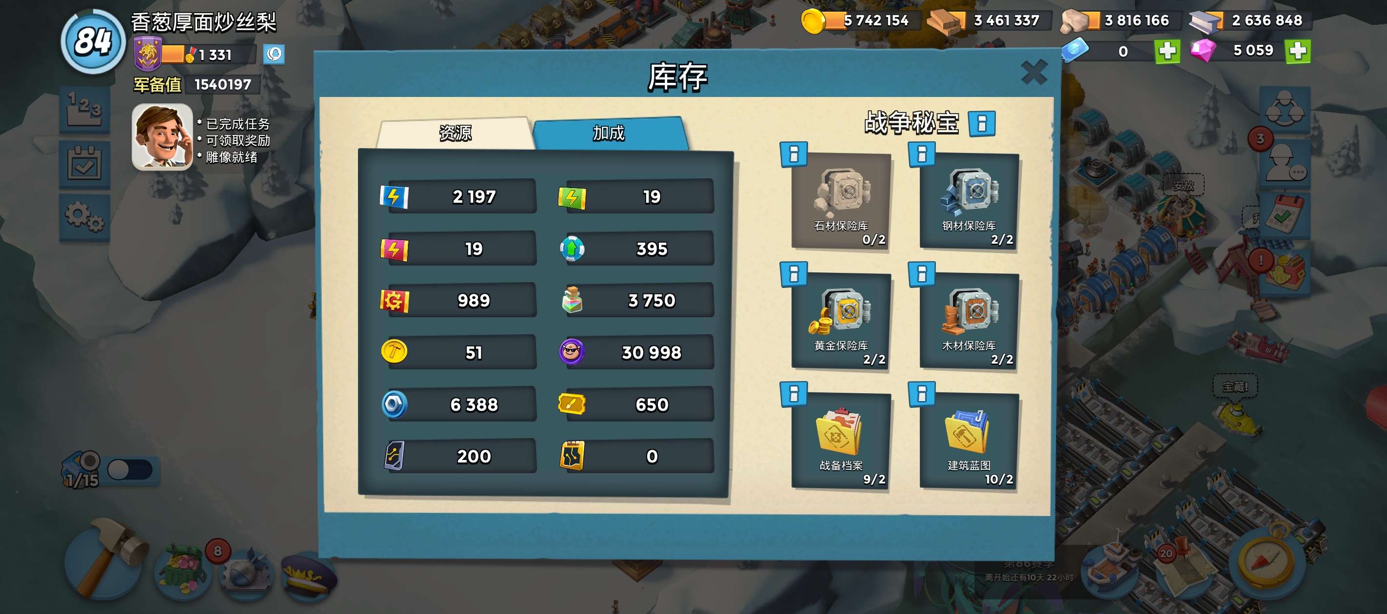 2000+省时卷共计600+小时;资源船上亿,密保管够,50+建筑币和大量档案密保,29本可以秒满。