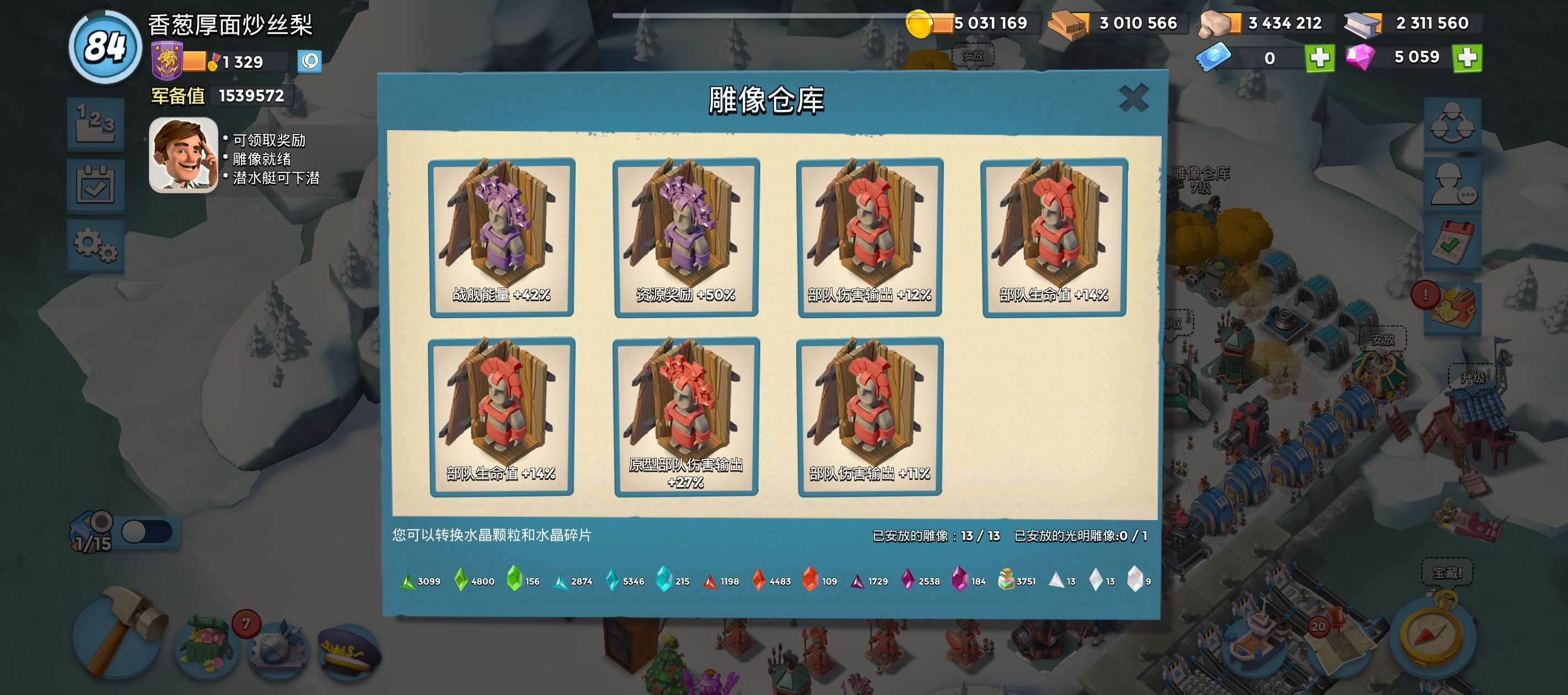 5059钻石,现药3751,合药7049,雕像193全满,有很多满数值雕像随时替换。