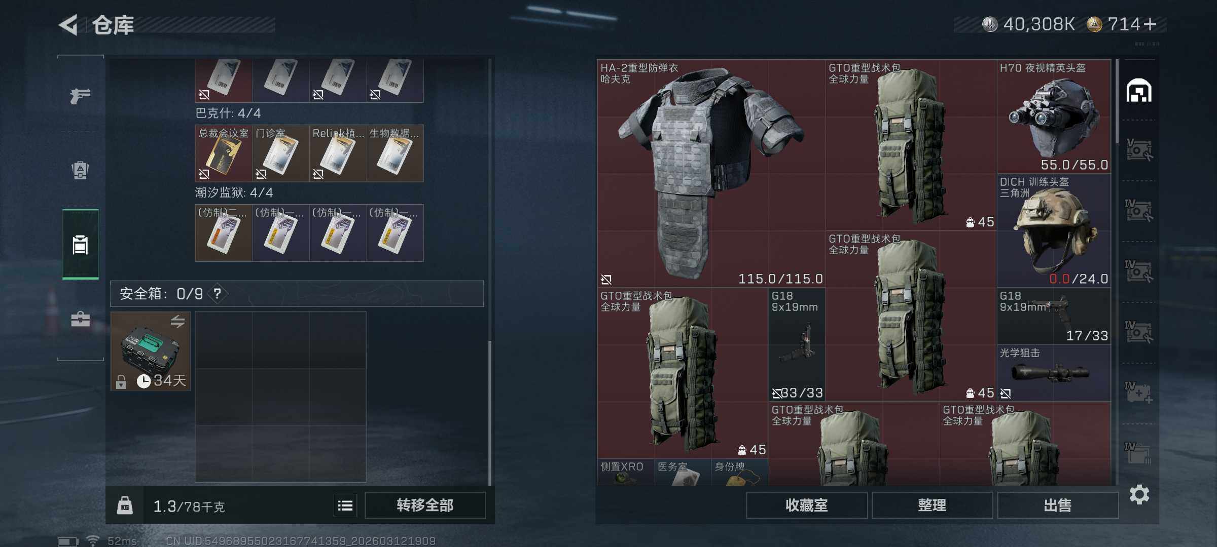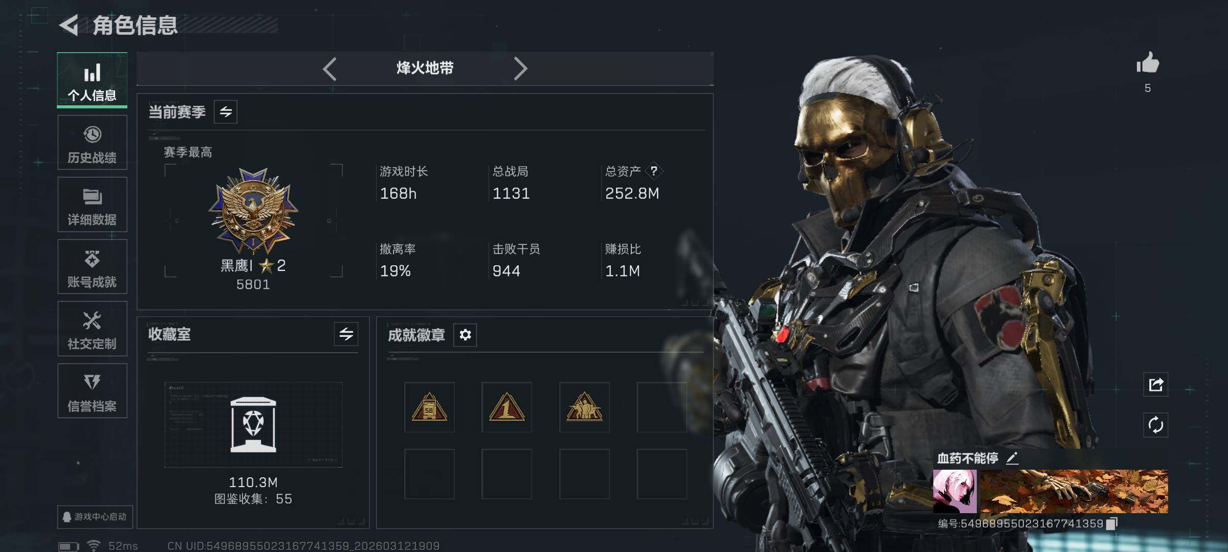 【sjs9478】玩够能回血 疯狂猛攻号 特勤体力6负重4 1红皮 250m资产 赛季33 蚀金玫瑰 sjs9478 烽火地带段位: 黑鹰 全面战场段位: 无段位 总资产: 252000000 哈夫币: 40308000 干员外观: 红狼-蚀金玫瑰,乌鲁鲁-荒原猎手 传说武器皮肤: M4A1突击步枪-蚀金玫瑰,勇士冲锋枪-能天使-午夜邮差,Vector冲锋枪-能天使-午夜邮差,SCAR-H战斗步枪-启航,近战-处刑者,M14射手步枪-蛮荒,K416突击步枪-行动记录,腾龙突击步枪-马年祥瑞,G1