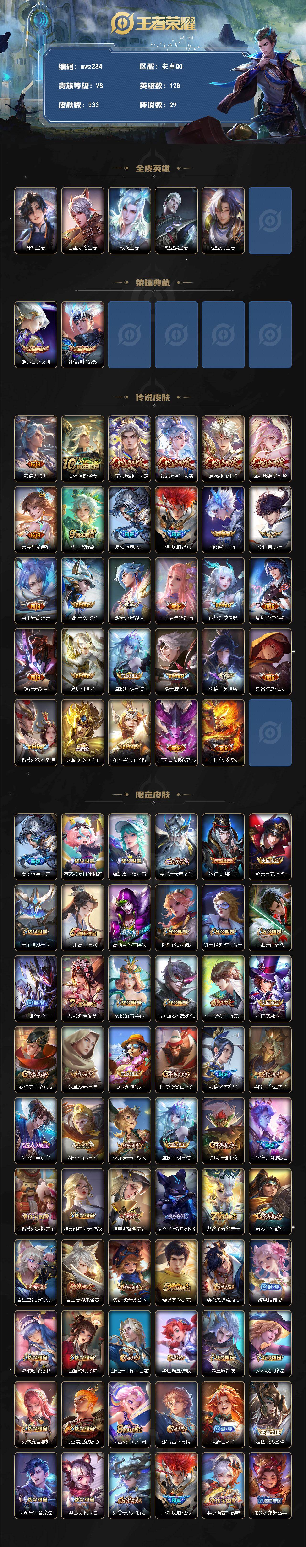 【mwz284】安卓Q-V8-最强王者段位-128英雄-333皮肤-2典藏皮肤-29传说-107史诗