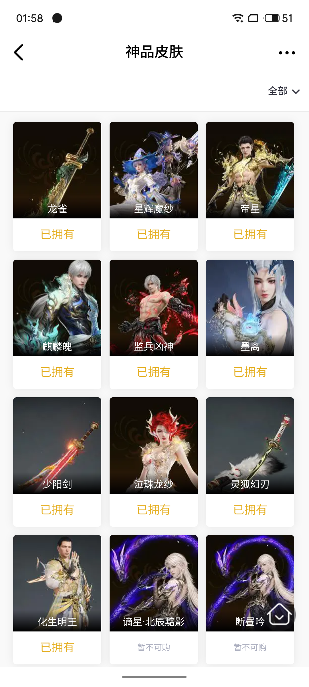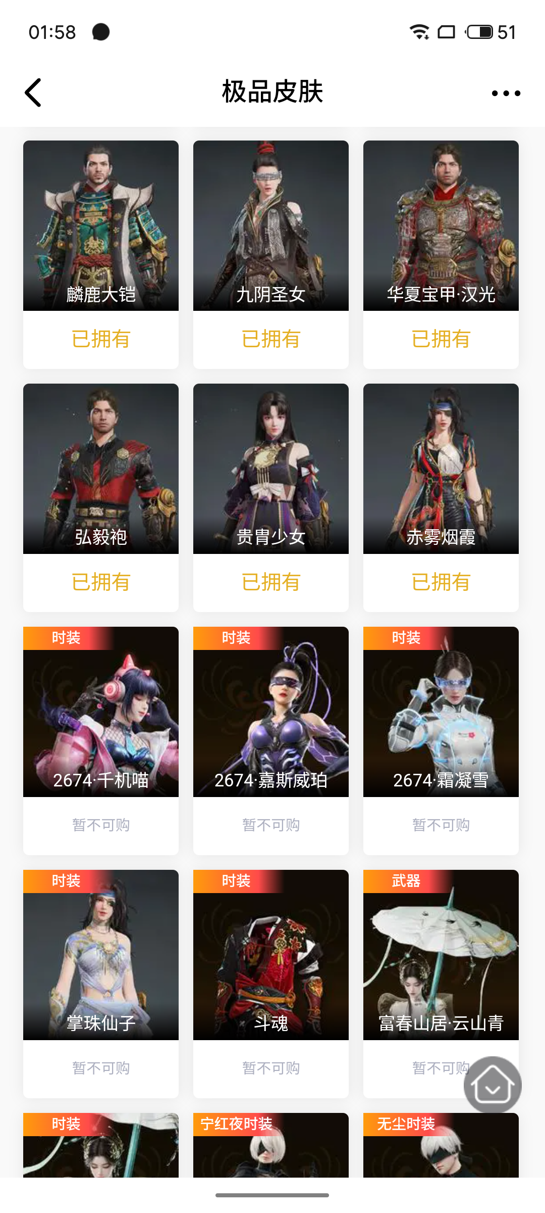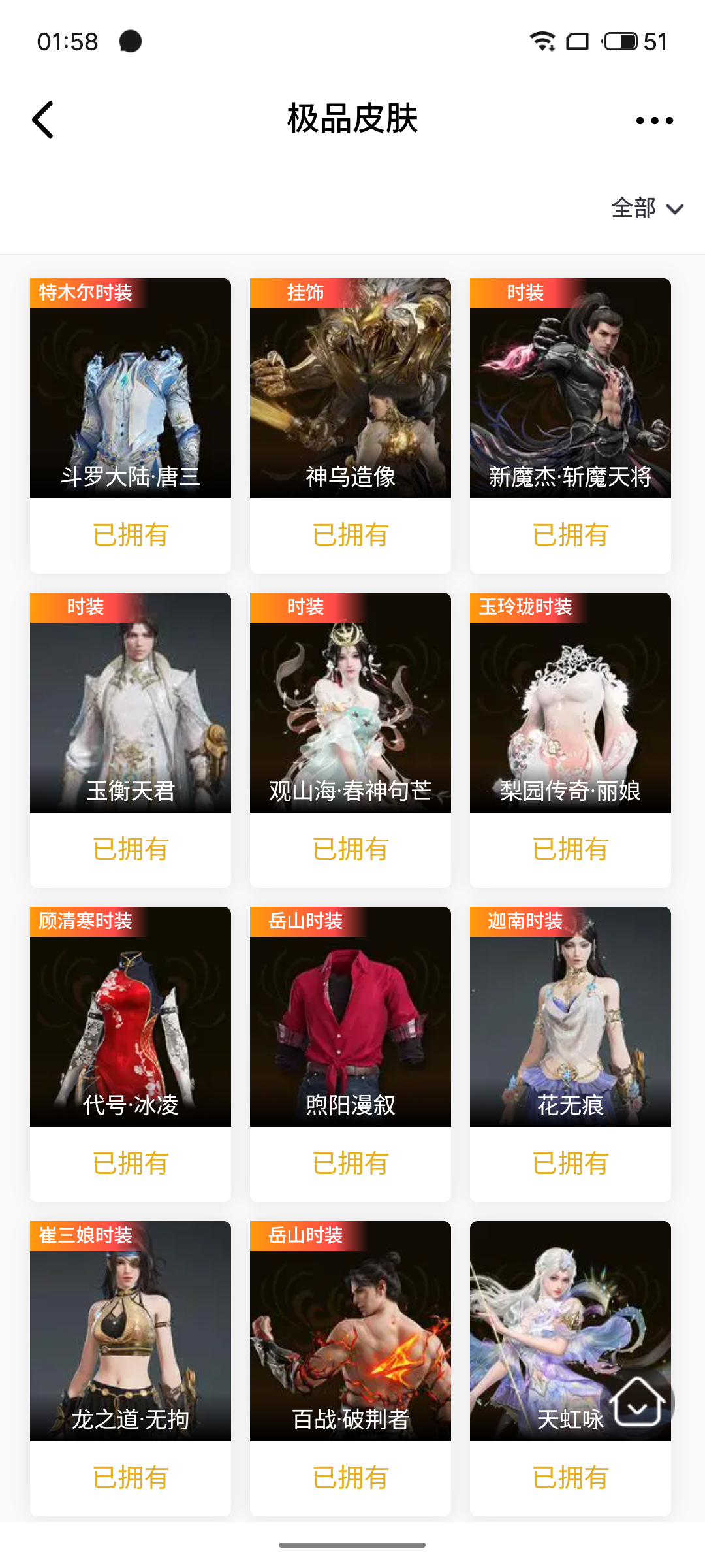 【极品皮肤】 天虹咏 赤焰战灵 护世四法·广目天王 封神录·申公豹 封神录·姜子牙 观山海·獬豸 街头狂欢·涂鸦少女 斗罗大陆·唐三 长歌诗韵·戍关将 神乌造像 云溪仙子 追猎 御宅罗梦 游四海 玄青郁离 麟鹿大铠 九阴圣女 华夏宝甲·汉光 弘毅袍 贵胄少女 赤雾烟霞 新魔杰·斩魔天将 玉衡天君 观