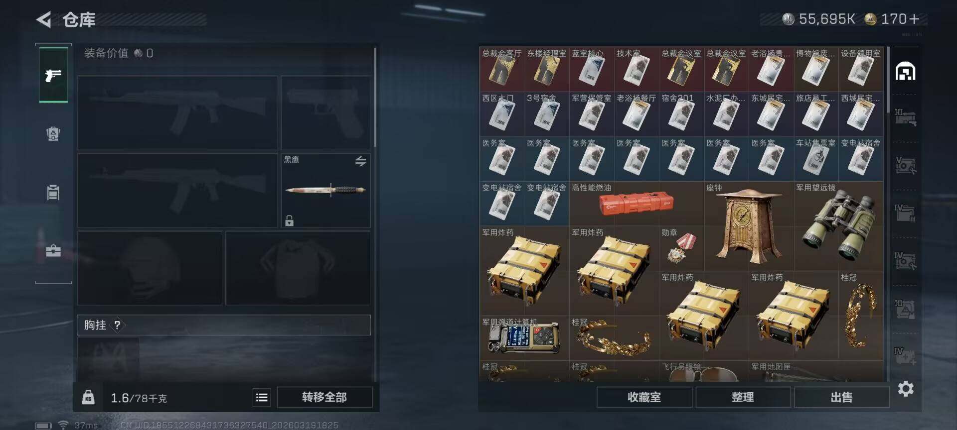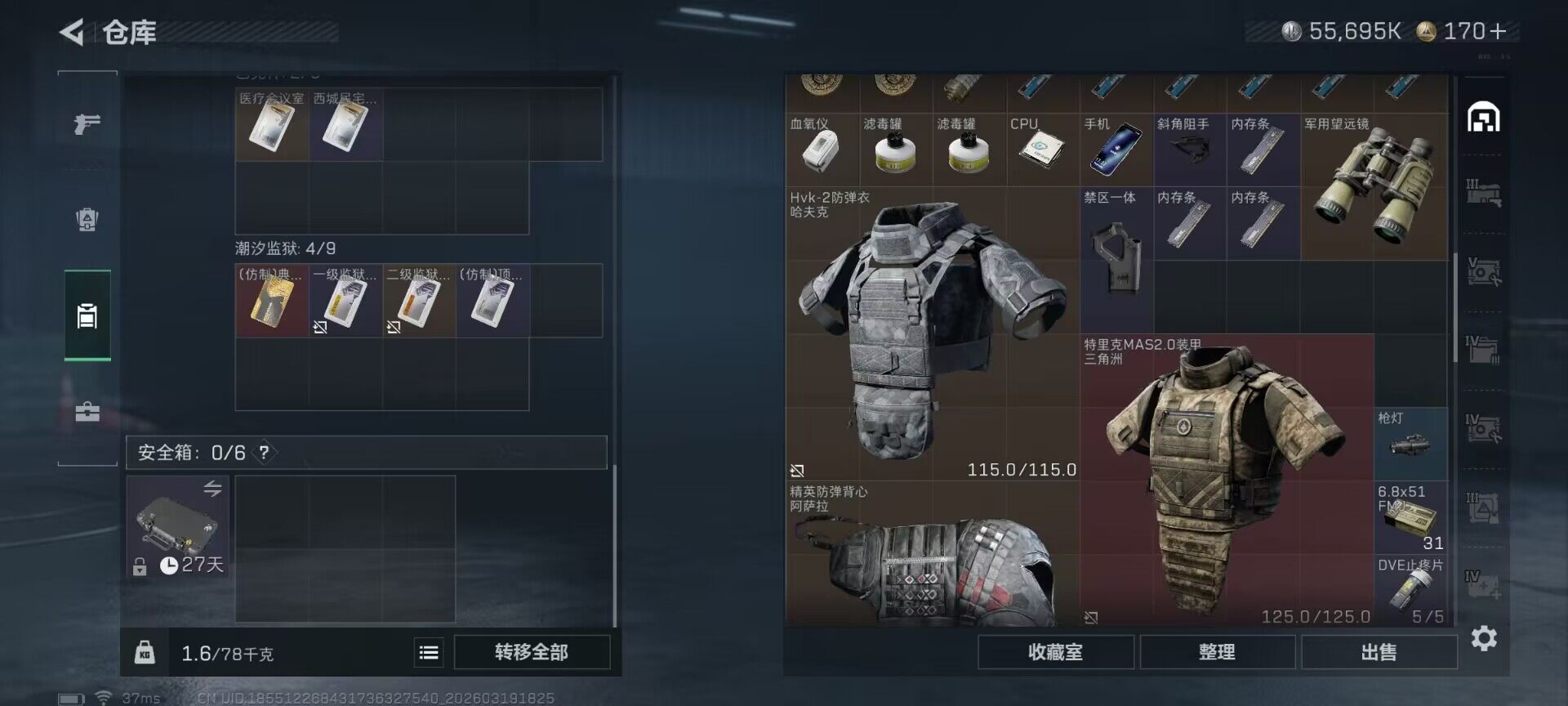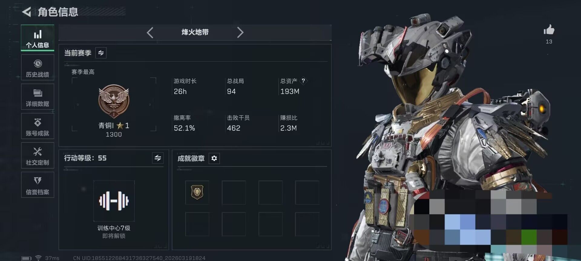 总资产(M):192M/哈夫币(K):55695K/ 传说枪皮数:13/全面战场等级:1_段位:无段位/烽火地带等级:55_段位:青铜/
