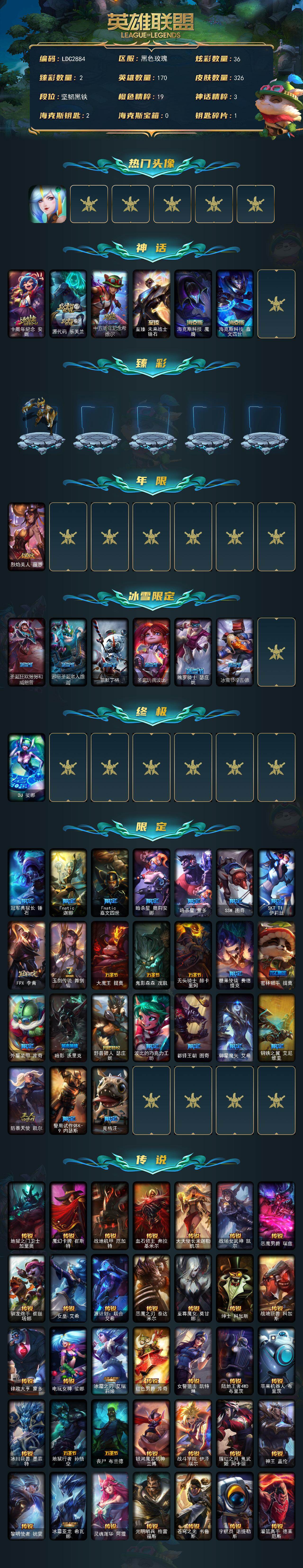 【LDC2884】170英雄/326皮肤/1终极/6神话/31限定/2臻彩/36炫彩/37传说/72史诗/未定级/春晖神女头像/十周年纪念安妮/源代码乐芙兰/十五周年纪念希维尔/至臻未来战士锤石/海克斯科技魔腾/海克斯科技嘉文四世/冠军之刃锐雯2016凯旋圣装/冠军之血希瓦娜凯旋圣装/烈焰美人薇恩/圣诞狂欢努努和威朗普/邪恶圣诞老人维迦/雪默丁格/圣诞玩偶波比/魄罗骑士瑟庄妮/冰雪节辛吉德/DJ娑娜/冠军典狱长锤石/Fnatic迦娜/Fnatic嘉文四世/暗杀星奥莉安娜/暗杀星蒙多/SSW图奇/