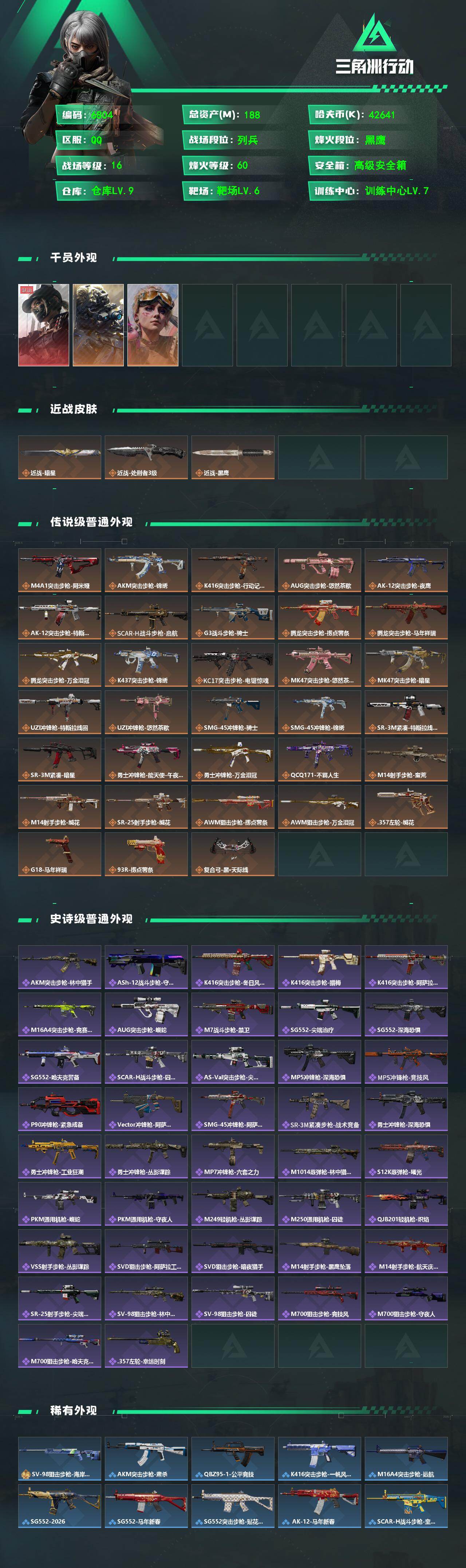 等级:60总资产:188.9M 纯币42641K 红皮:黑天际线 刀皮:暗星,处刑者 特勤处:仓库9,训练7,靶场6