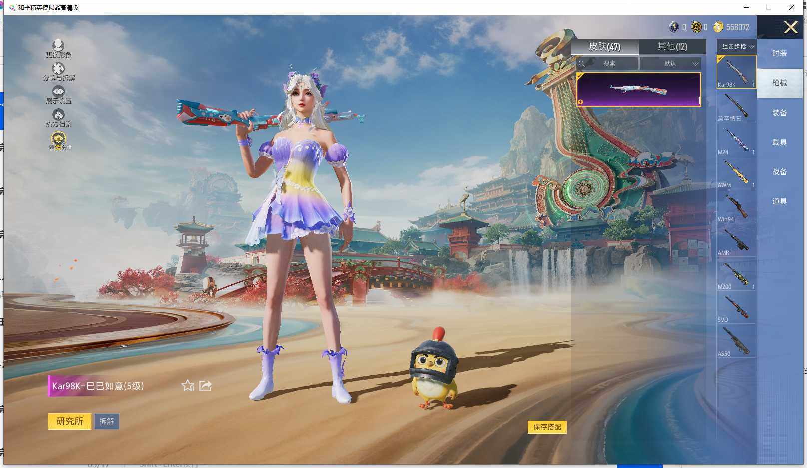 实名: 可修改 时装数: 61 枪械数: 47 战备数: 31 稀有枪皮: Kar98K-巳巳如意(五级),DP-28-豹影疾电(五级)