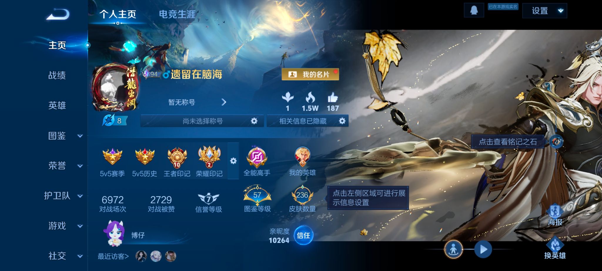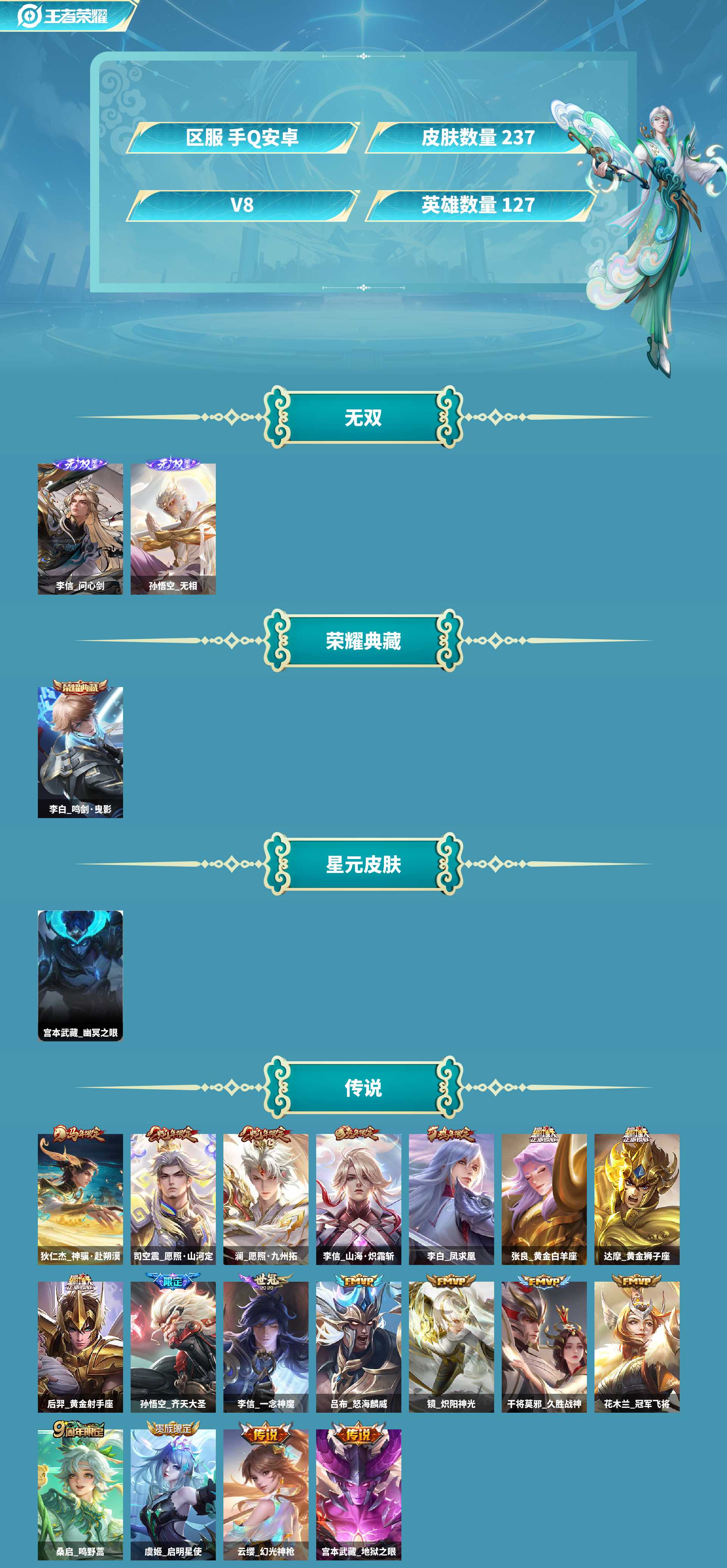 皮肤数量236印记总数12V8最强王者暂时不可修改账号类型4