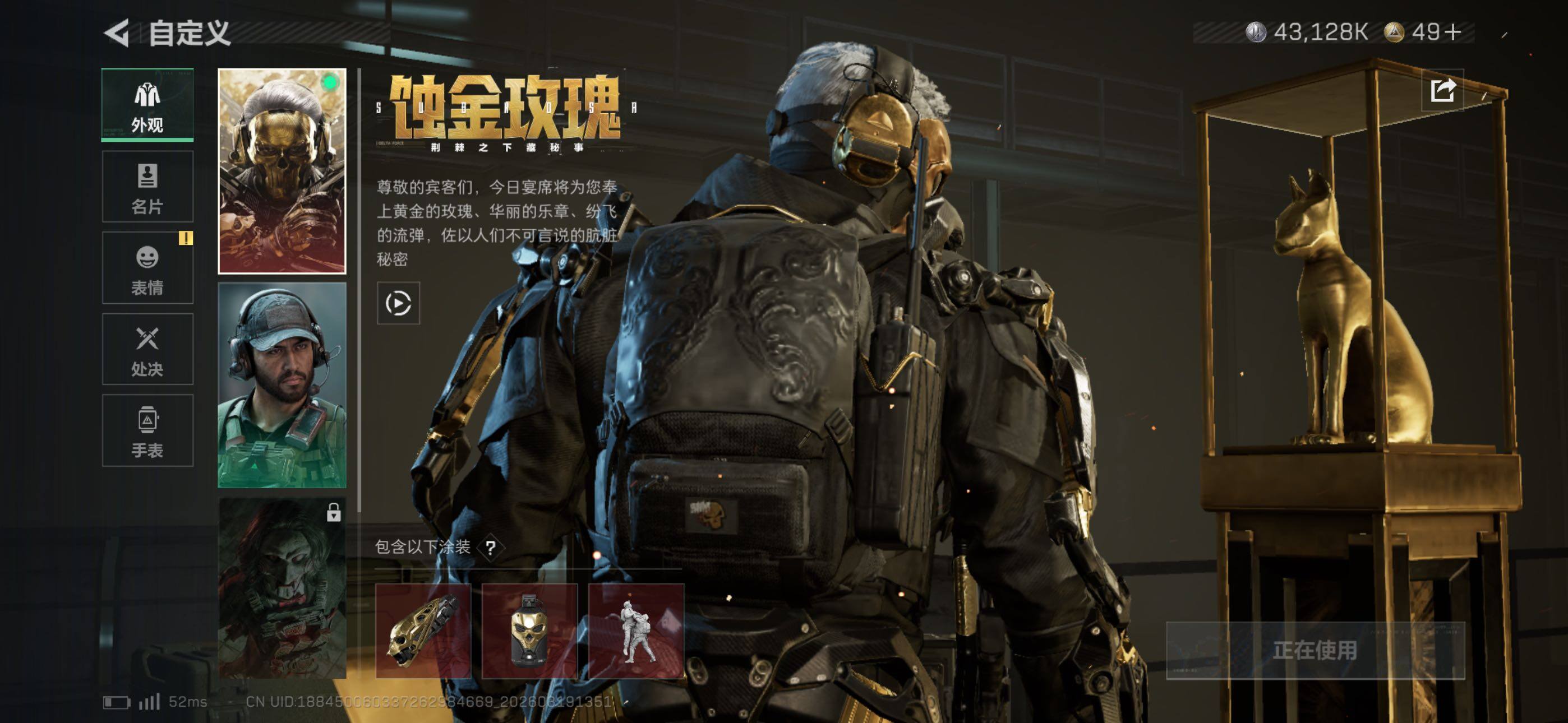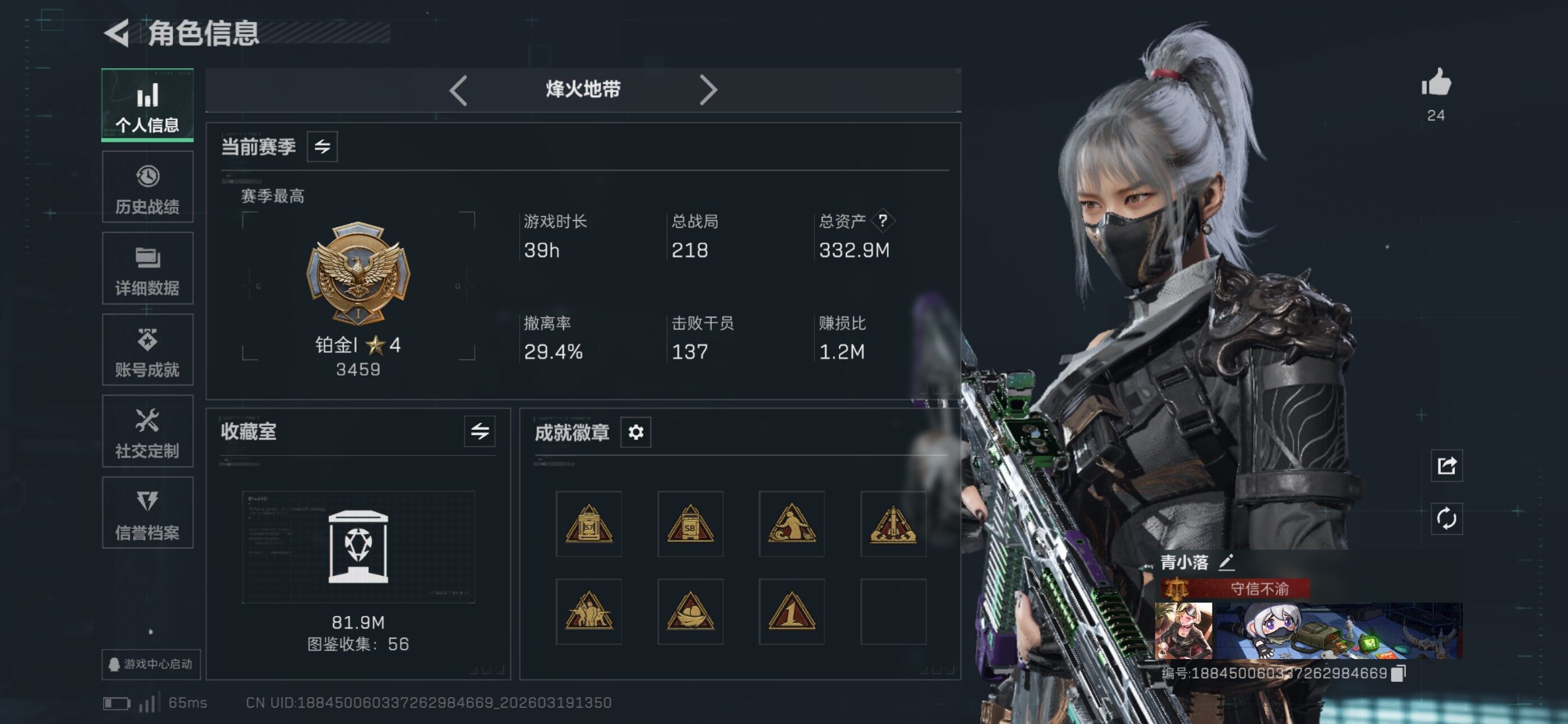 {特价出售}等级:60 总资产:332.9M 纯币43128k 隐藏挂饰:毁灭之源 红皮:蚀金玫瑰,水墨云图 刀皮:北极星 砖皮: k416命运王牌(优品b)m7棱镜(优品c)特勤处:仓库8,训练6,靶场4 部门22312
