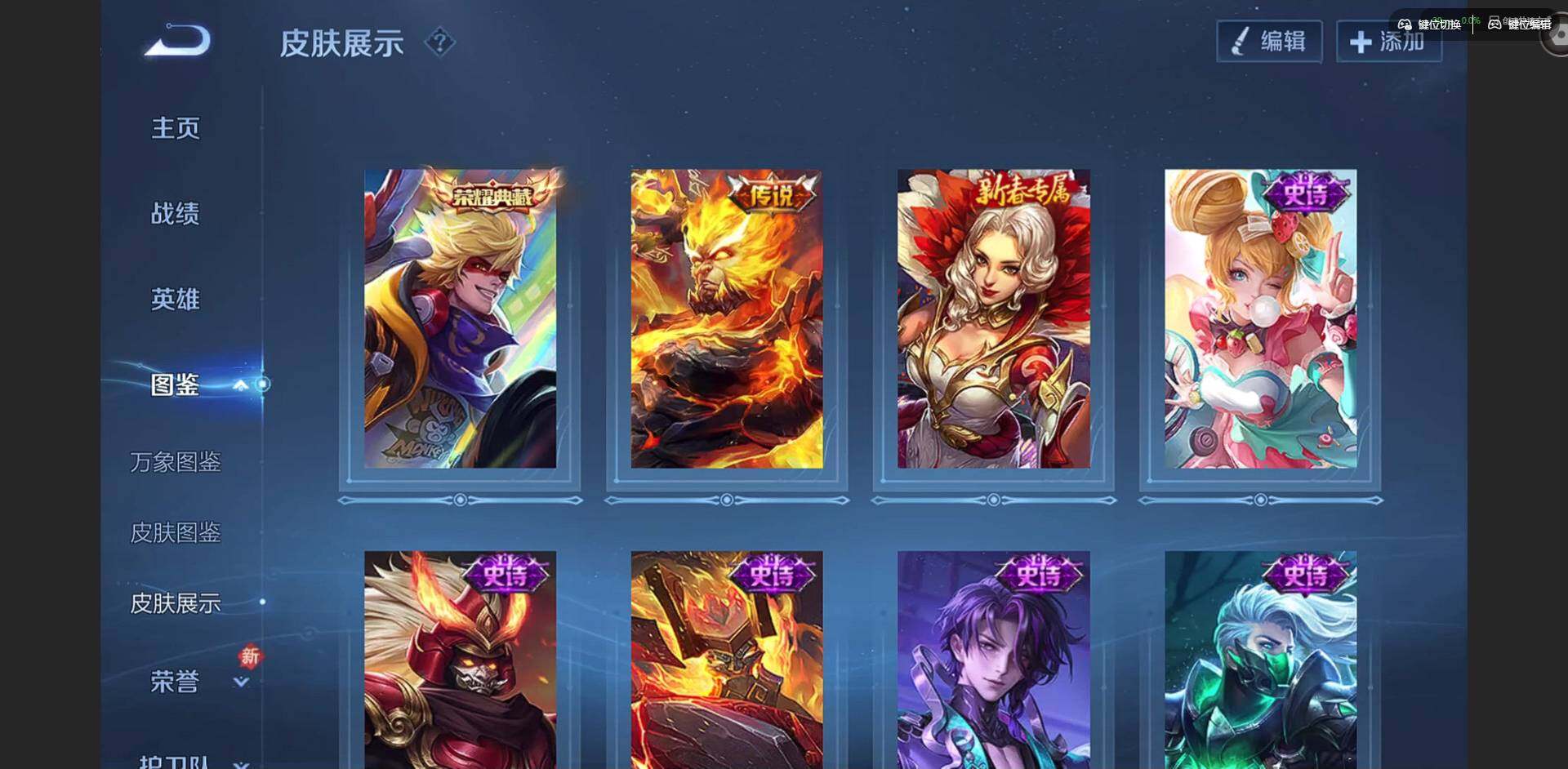 贵族等级: V6 英雄数: 96 皮肤数: 91 荣耀水晶: 全息碎影 星传说: 幽冥之眼,幽冥火 传说皮: 地狱火,地狱之眼,澜逐花归海,乘龙·铭钟鼎,神树通天,神骥·越千峰 限定皮: 齐天大圣