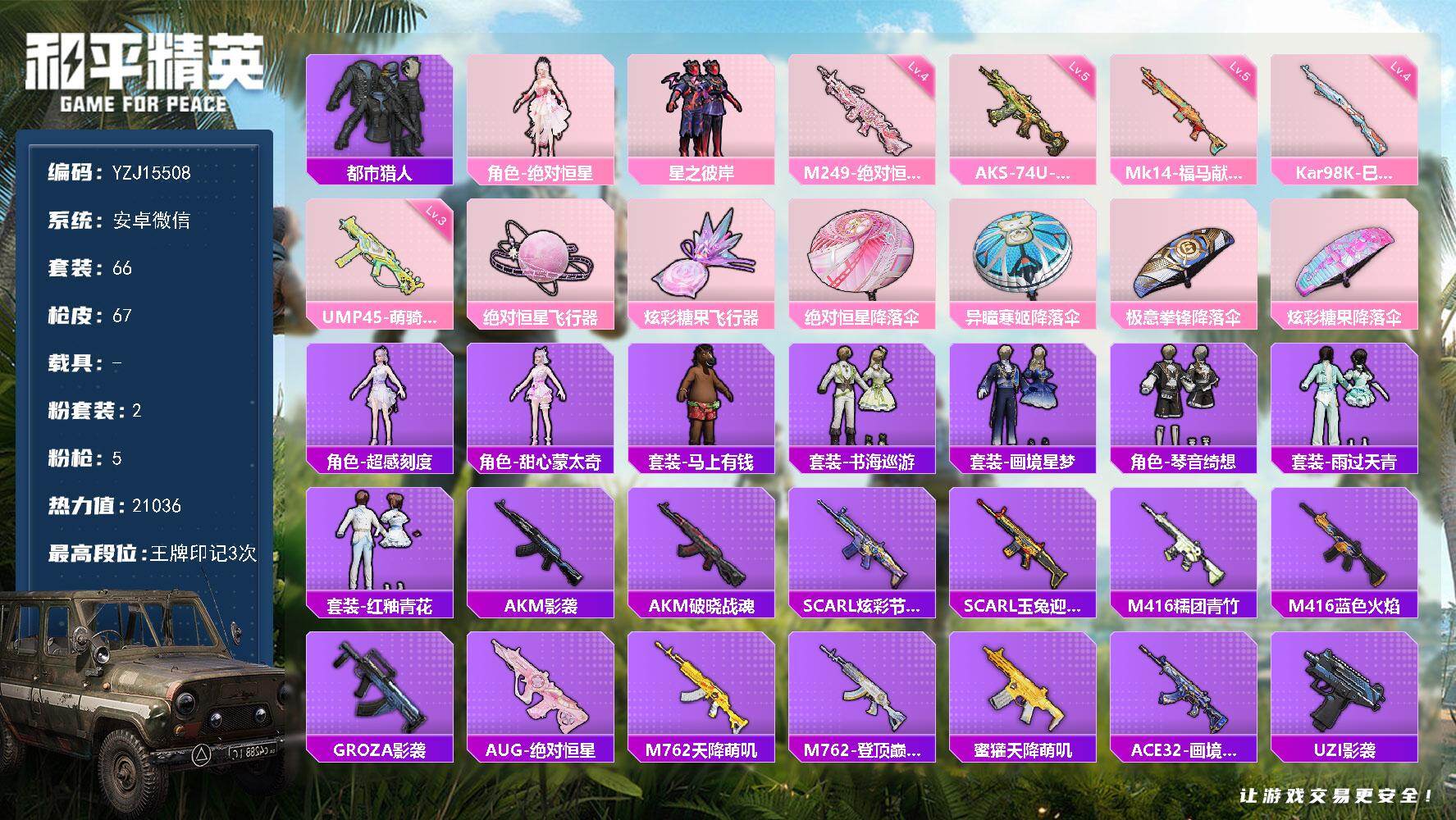 2515211_无二次安卓V-1稀有2粉装5特效枪4热门66套装67枪皮21036热力值极品小素材号星之彼岸绝对恒星都市鲨鱼服4级M249绝对恒星满级AKS森灵之息3印记历史卓越王牌18星【1稀有】都市猎人【2粉装】绝对恒星星之彼岸【5特效枪】Kar98K-巳巳如意(4级)M249-绝对恒星(4级)AKS-74U-森灵之息(5级)Mk14-福马献瑞(5级)UMP45-萌骑冒险(3级)【4热门】鹰眼