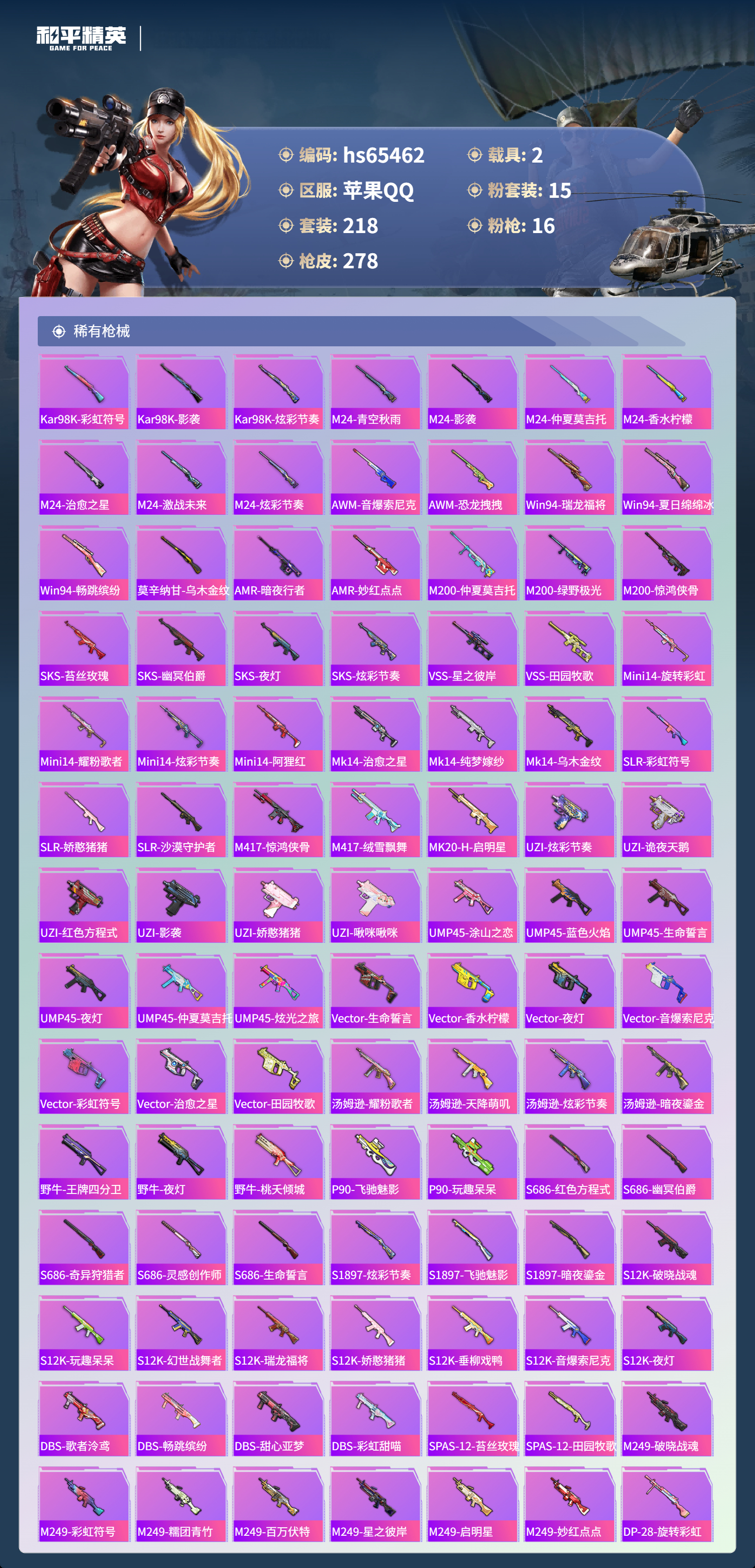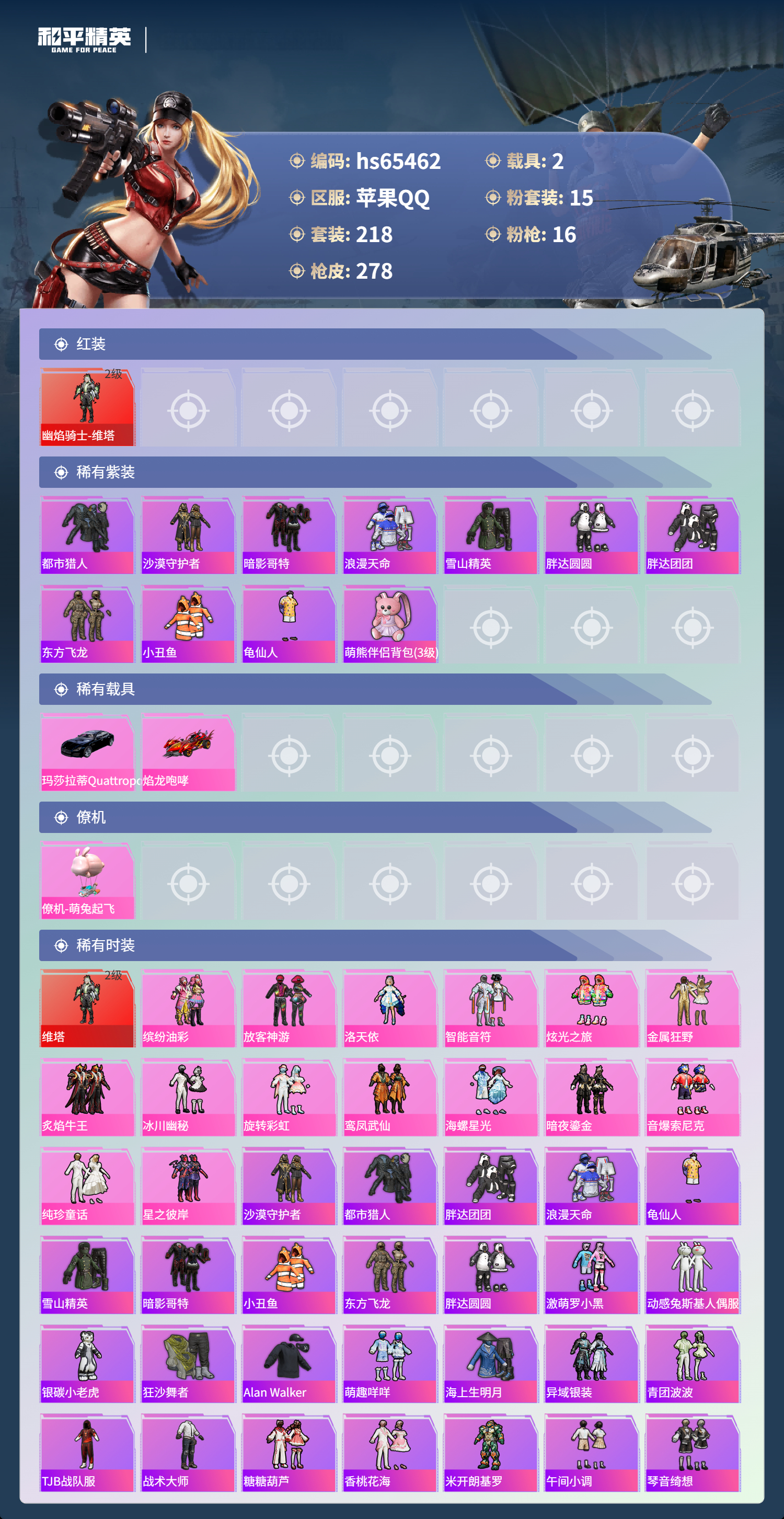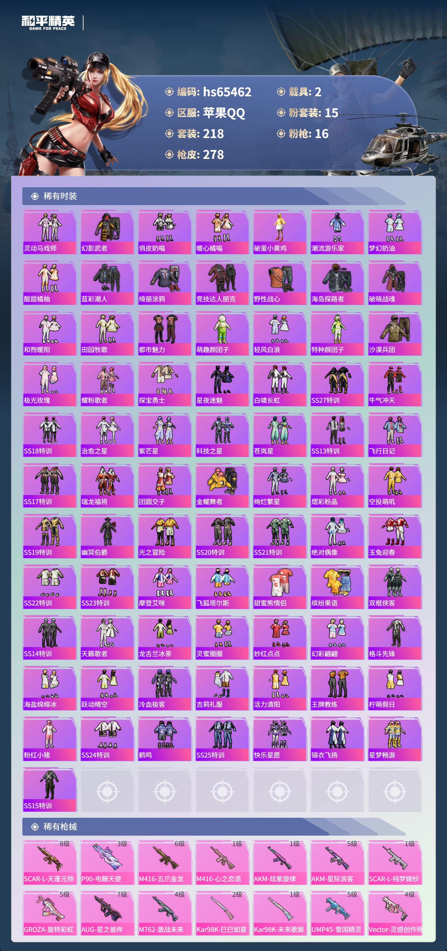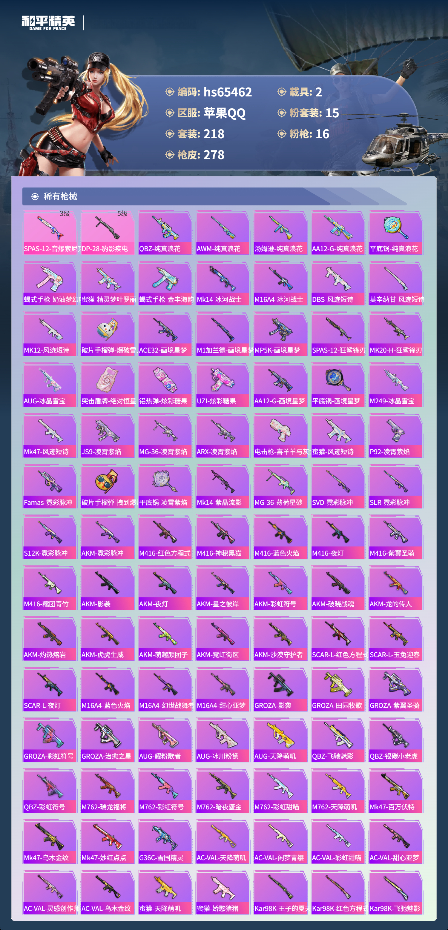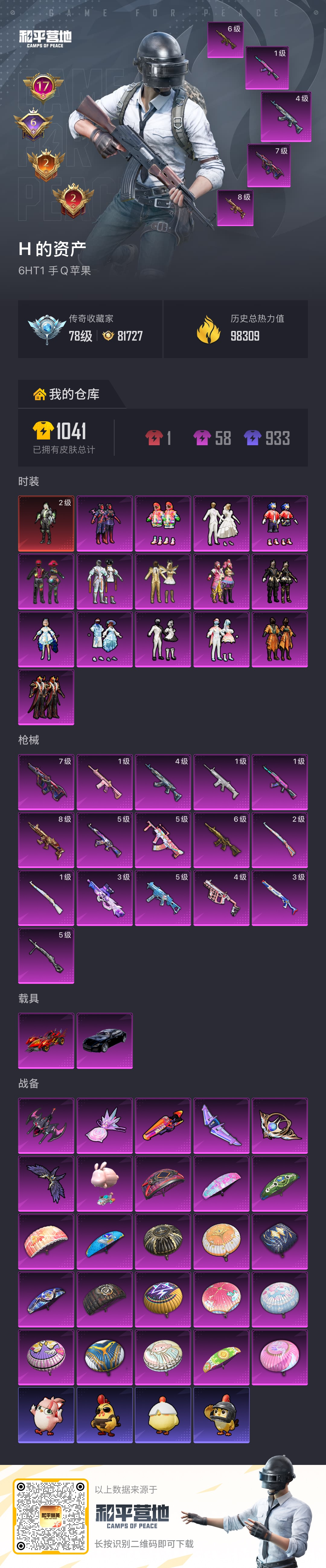 hs65462 苹果手Q-17王牌印记-有战神框-1红装-15粉装-16特效枪-2载具-98309热力值-218套装-278枪皮-6卓越印记-2传奇印记