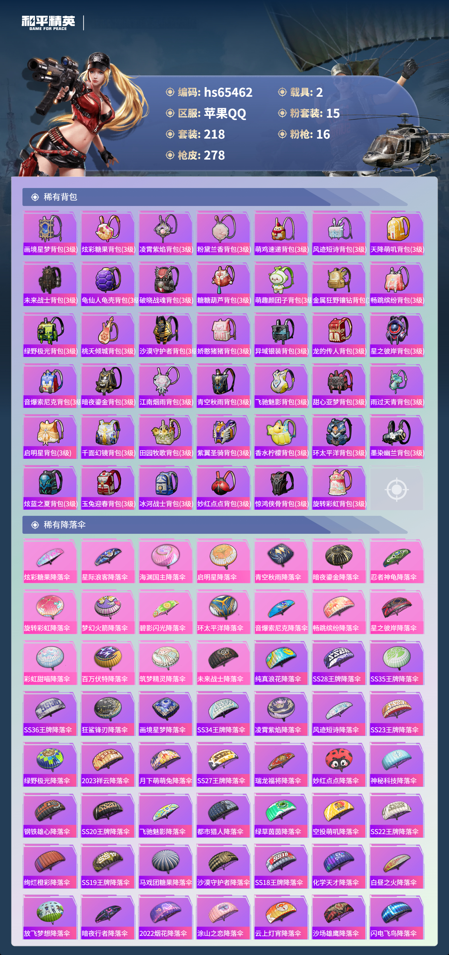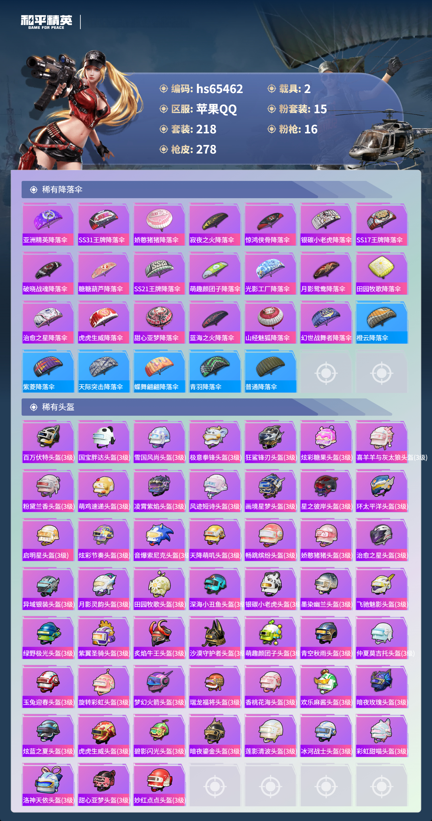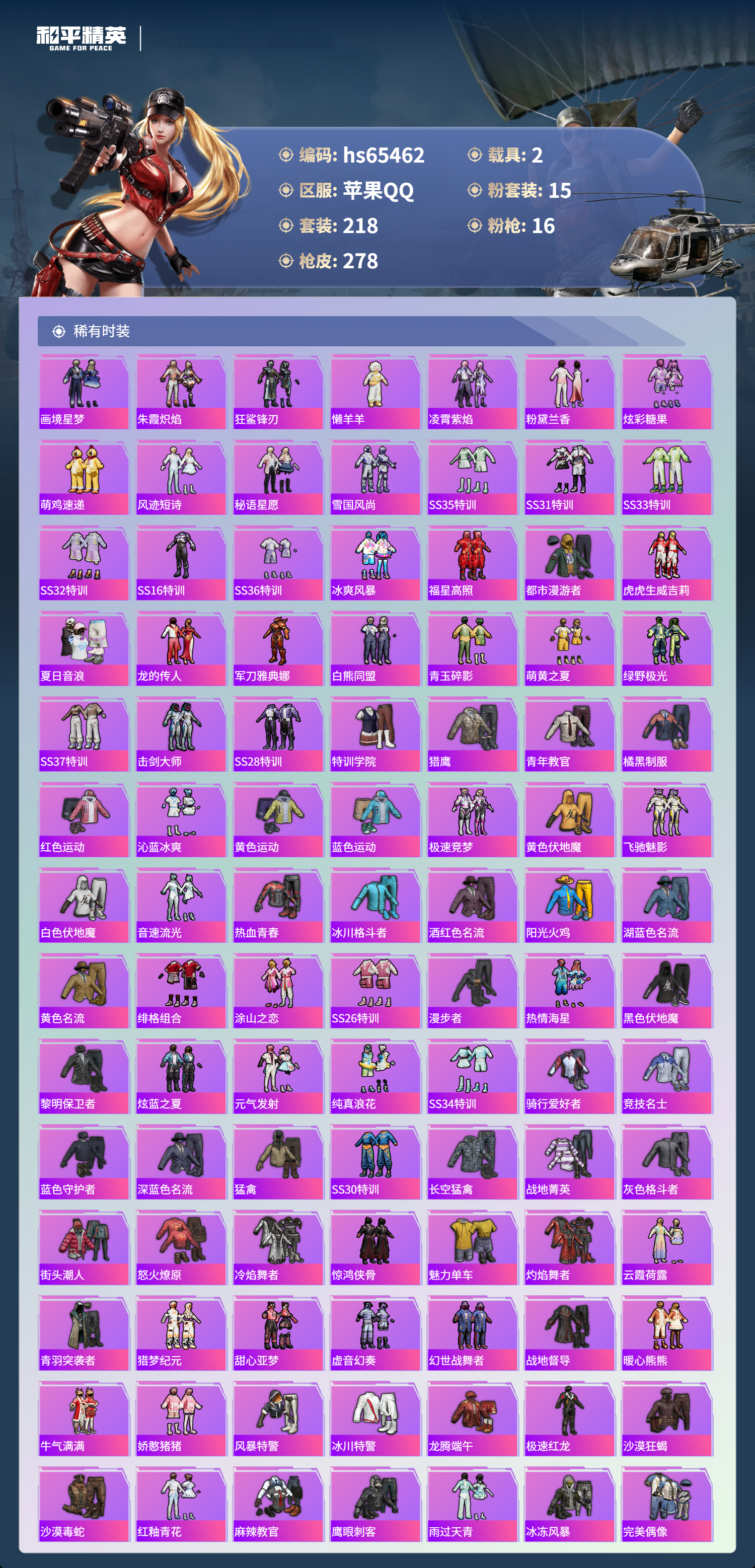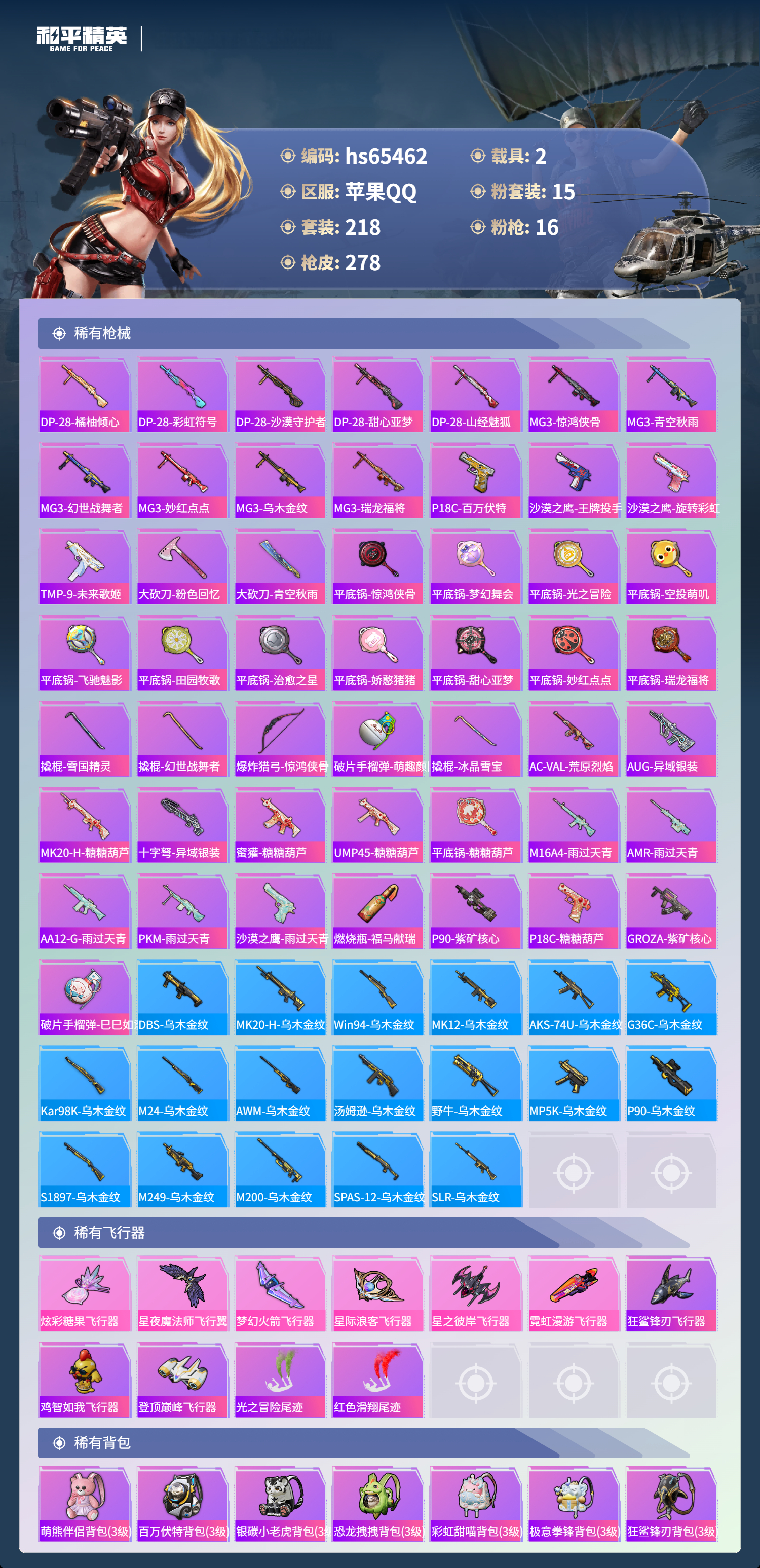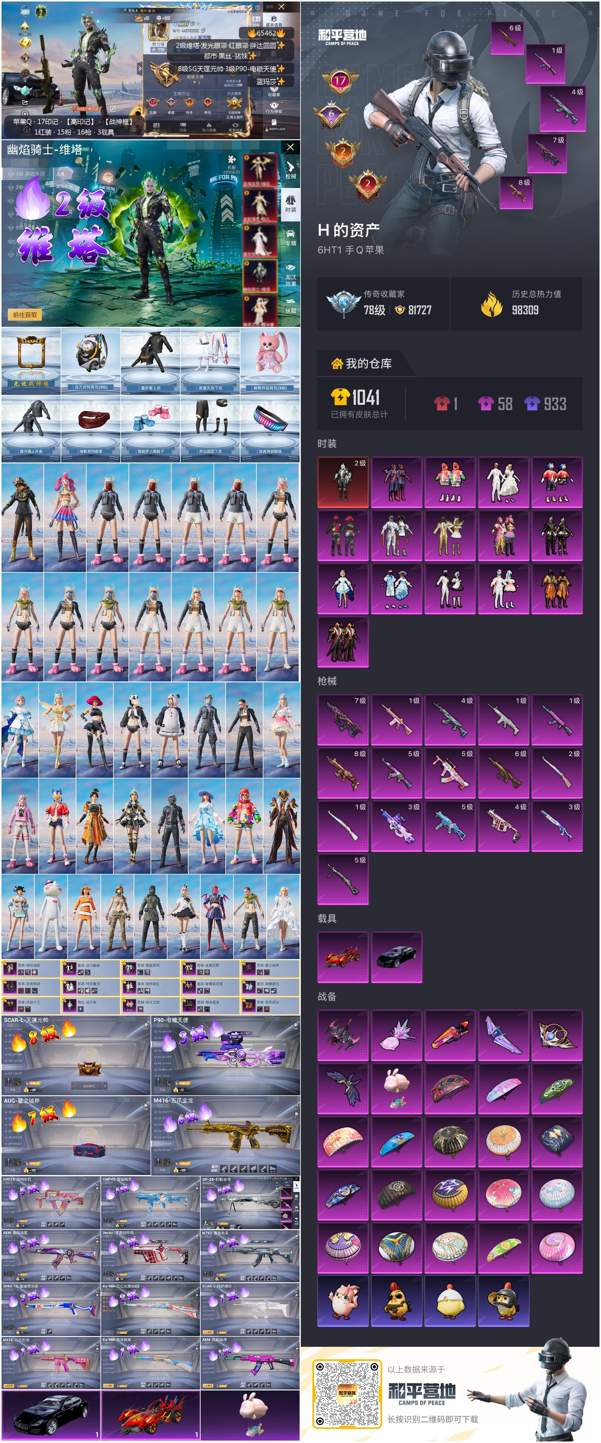 hs65462 苹果手Q-17王牌印记-有战神框-1红装-15粉装-16特效枪-2载具-98309热力值-218套装-278枪皮-6卓越印记-2传奇印记