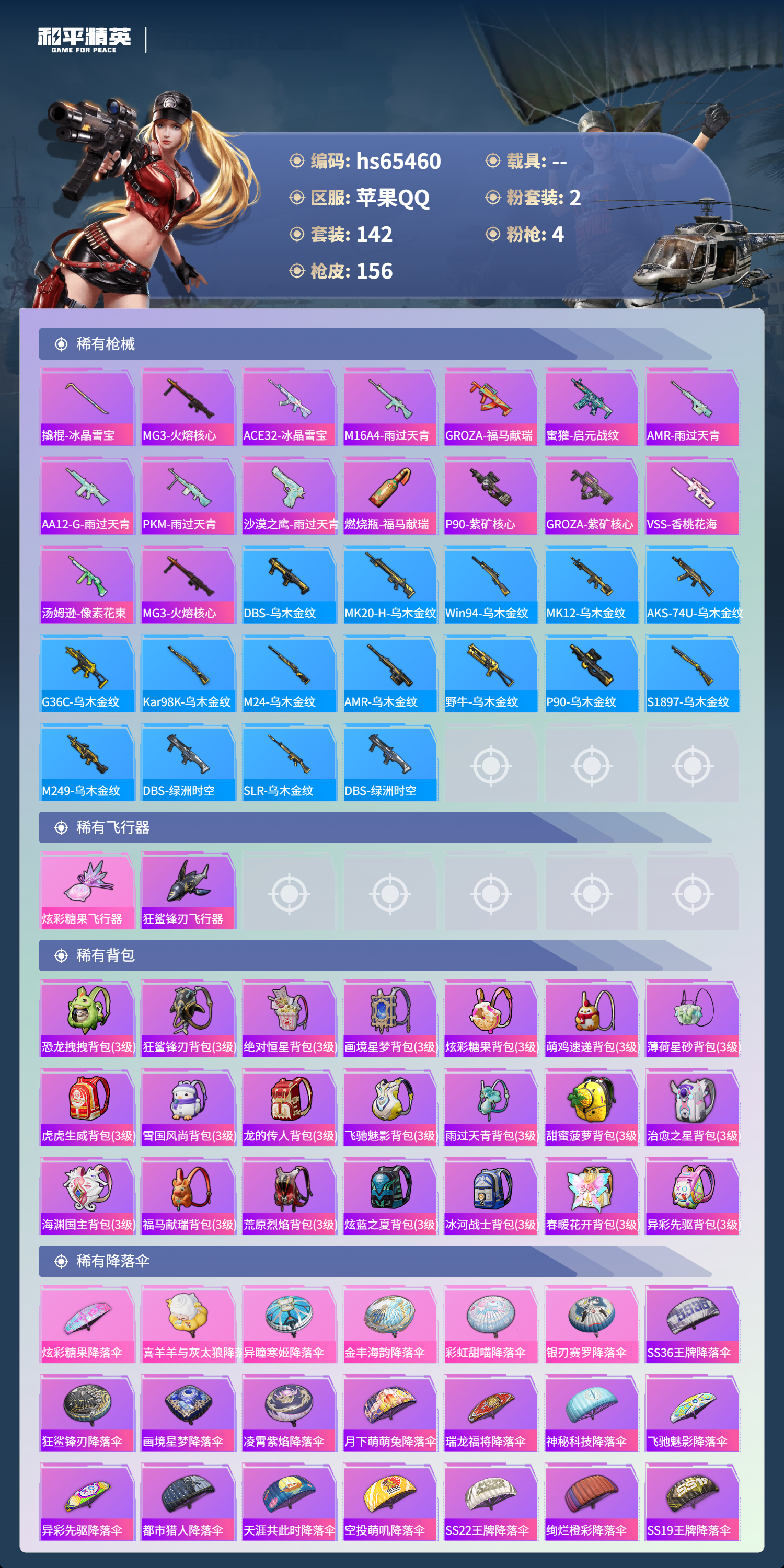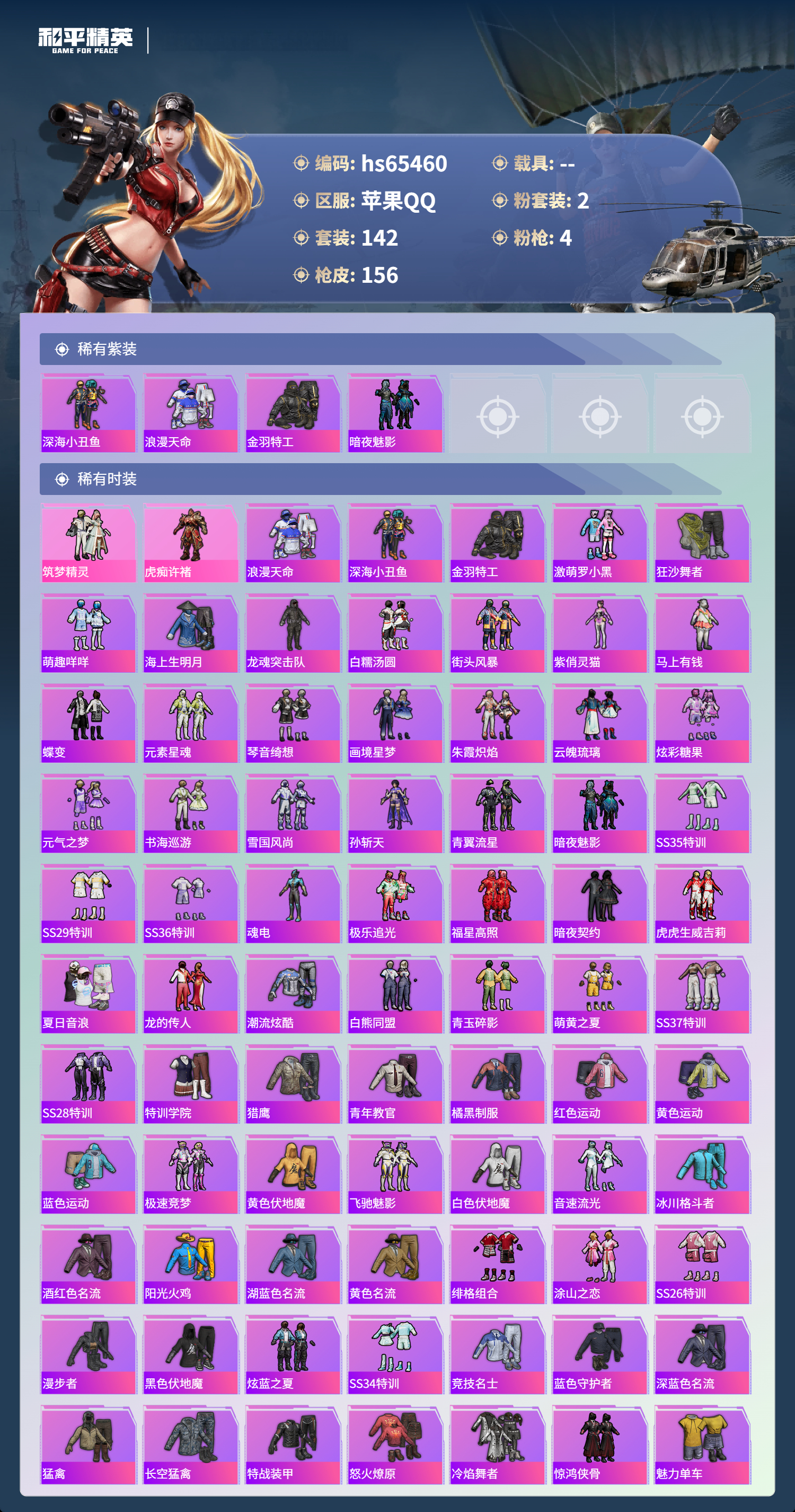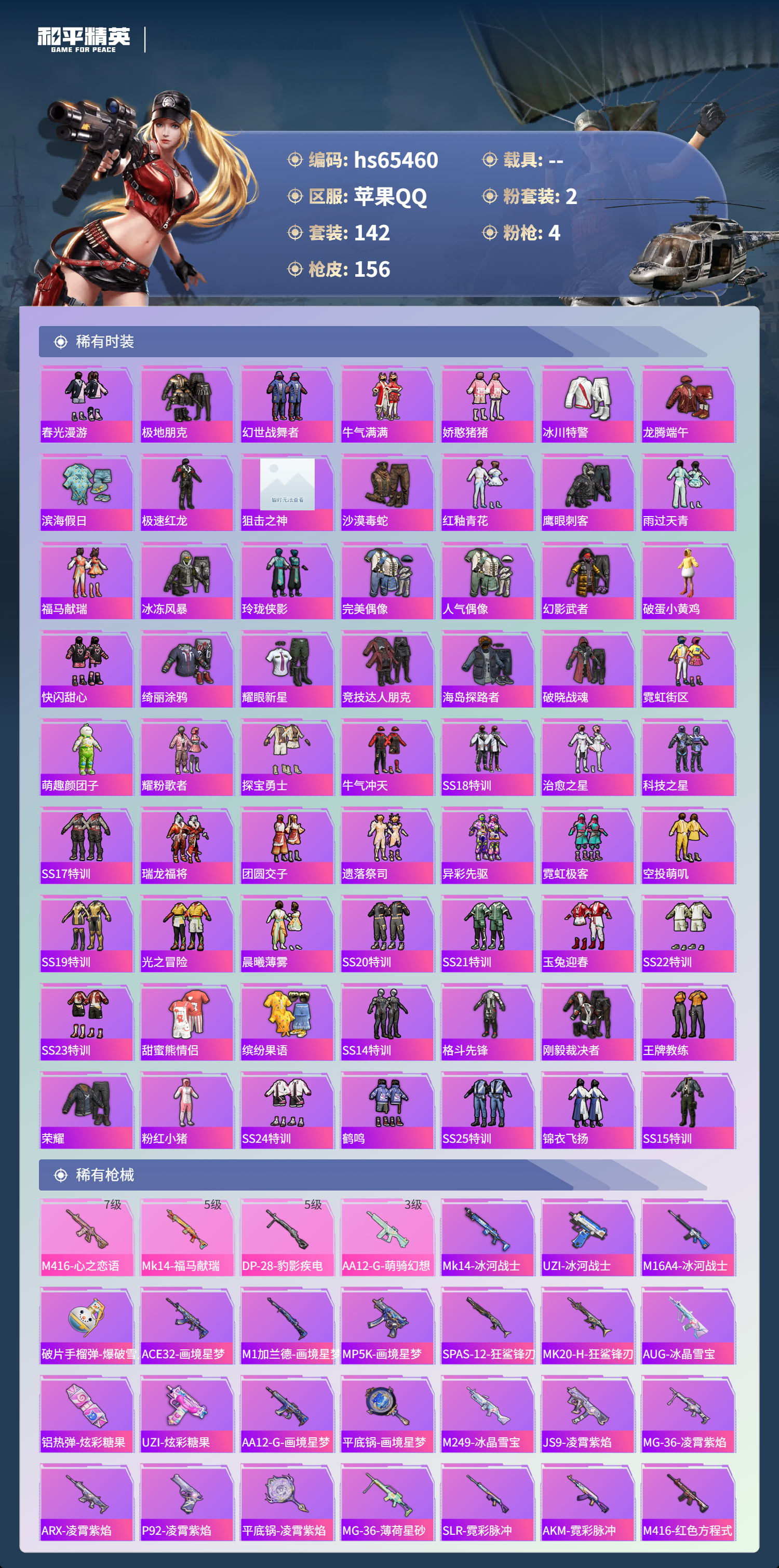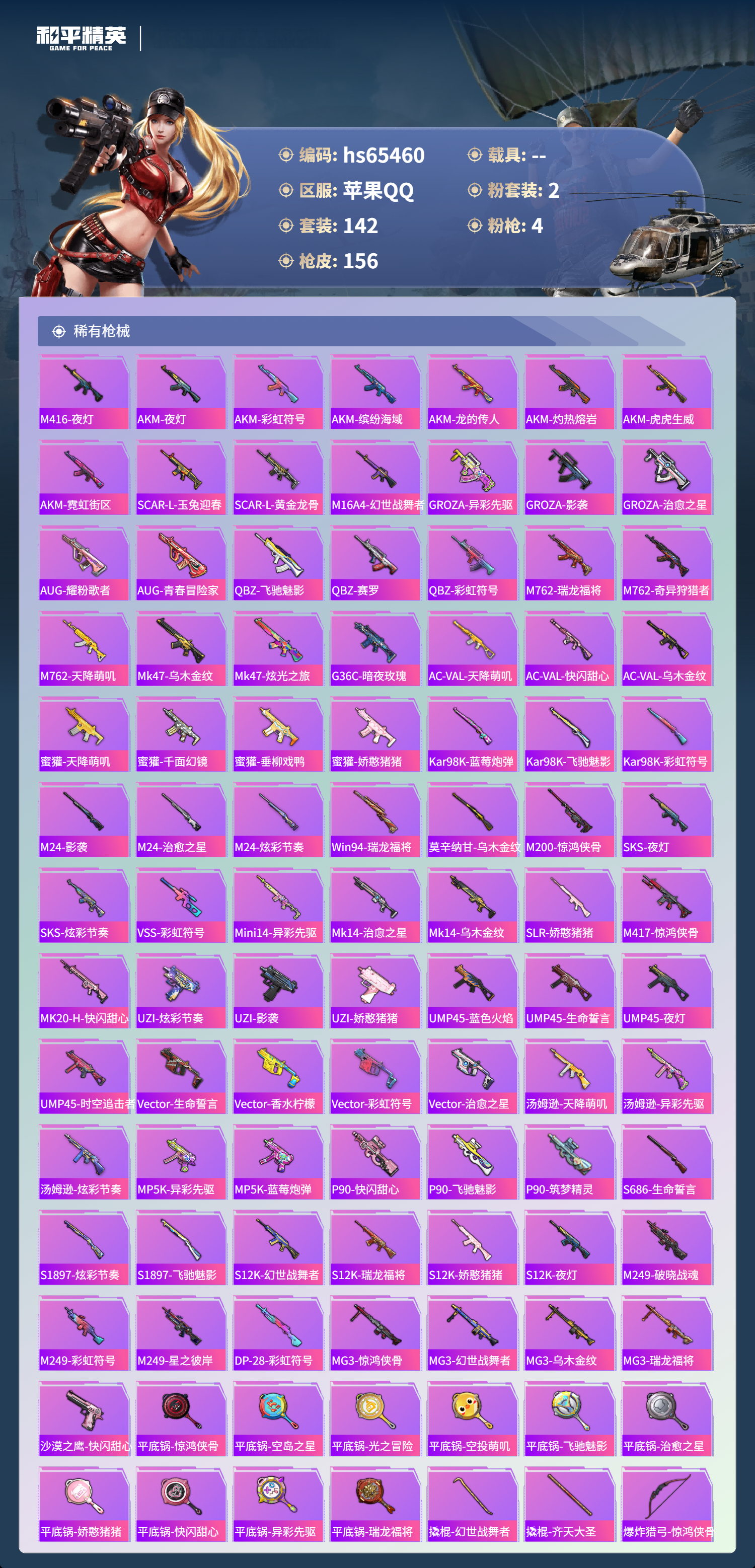 hs65460 苹果手Q-9王牌印记-2粉装-4特效枪-45629热力值-142套装-156枪皮