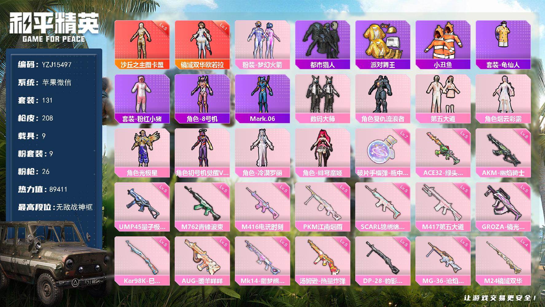 2515215_包实名-苹果V-2红装3稀有9载具9粉装27特效枪15热门【精氪神装素材AG粉丝logo优质主页面板多种不重复载具多特多载ss29赛季战神印记战神框5级神装图卡盟欧若拉火箭少女第五大道新版三色螳螂(魂环螳螂蓝螳螂粉螳螂)都市金鞋灵公主绒宝小鹅晶辉守护小丑鱼鲨鱼裤大橘为重卖崽青蛙3级M4灵猫魔法师6级AK幽焰骑士沙丘之主头盔星夜魔法师背包4款升级飞行器6种热门伙伴13款飞行器6张改名